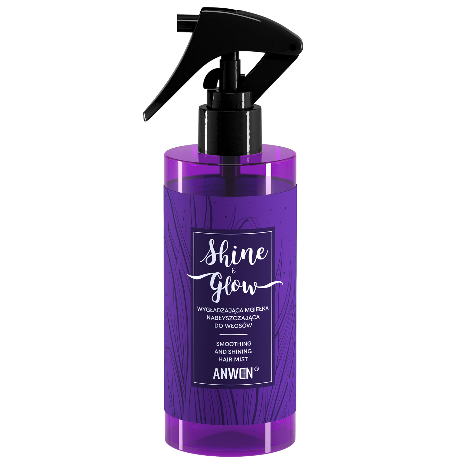 Anwen - Shine & Glow - mgiełka do włosów ułatwiająca rozczesywanie włosów, zapobiegająca elektryzowaniu i spektakularnie nabłyszczająca włosy tworząc na nich efekt tafli. Połączenie silikonów, betainy, inuliny i mocznika skutecznie wygładza włosy, nawilża i sprawia, że są jedwabiście miękkie. Kwas mlekowy przywraca prawidłowe pH, nabłyszcza i pozytywnie wpływa na stan skóry głowy. Mgiełka pozostawia na włosach delikatny film, który zabezpiecza je przed wysuszeniem.