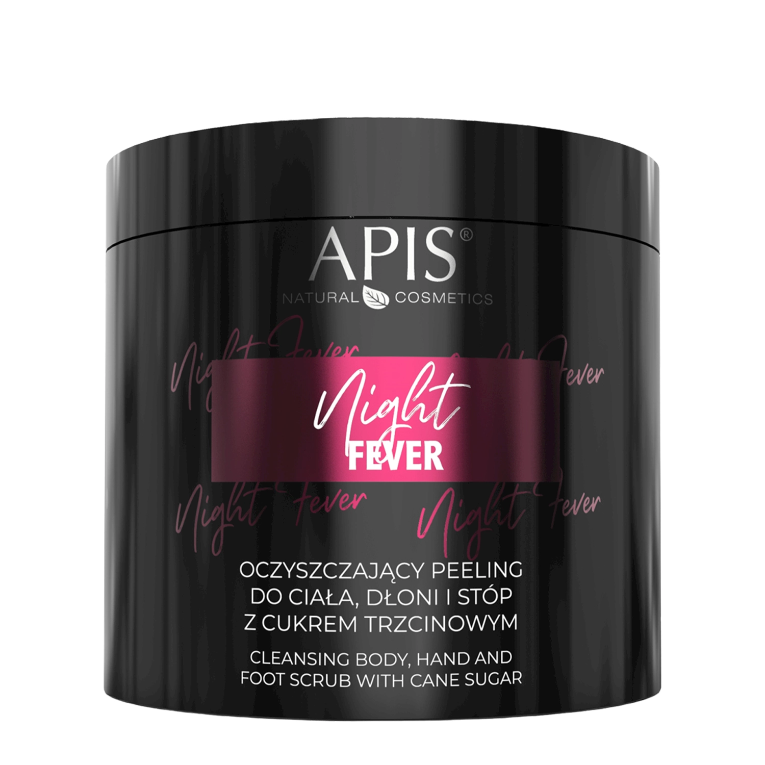 Apis - Night Fever - Oczyszczający Peeling do Ciała, Dłoni i Stóp z Cukrem Trzcinowym - peeling mechaniczny z cukrem trzcinowym, który skutecznie usuwa martwy naskórek, pozostawiając skórę gładką i przyjemnie miękką w dotyku. Dodatek oleju z nasion konopi łagodzi stany zapalne, a ekstrakt z kiełków pszenicy chroni przed szkodliwym działaniem wolnych rodników oraz działa odżywczo. Posiada przyjemny, orientalny zapach. Kosmetyk naturalny.