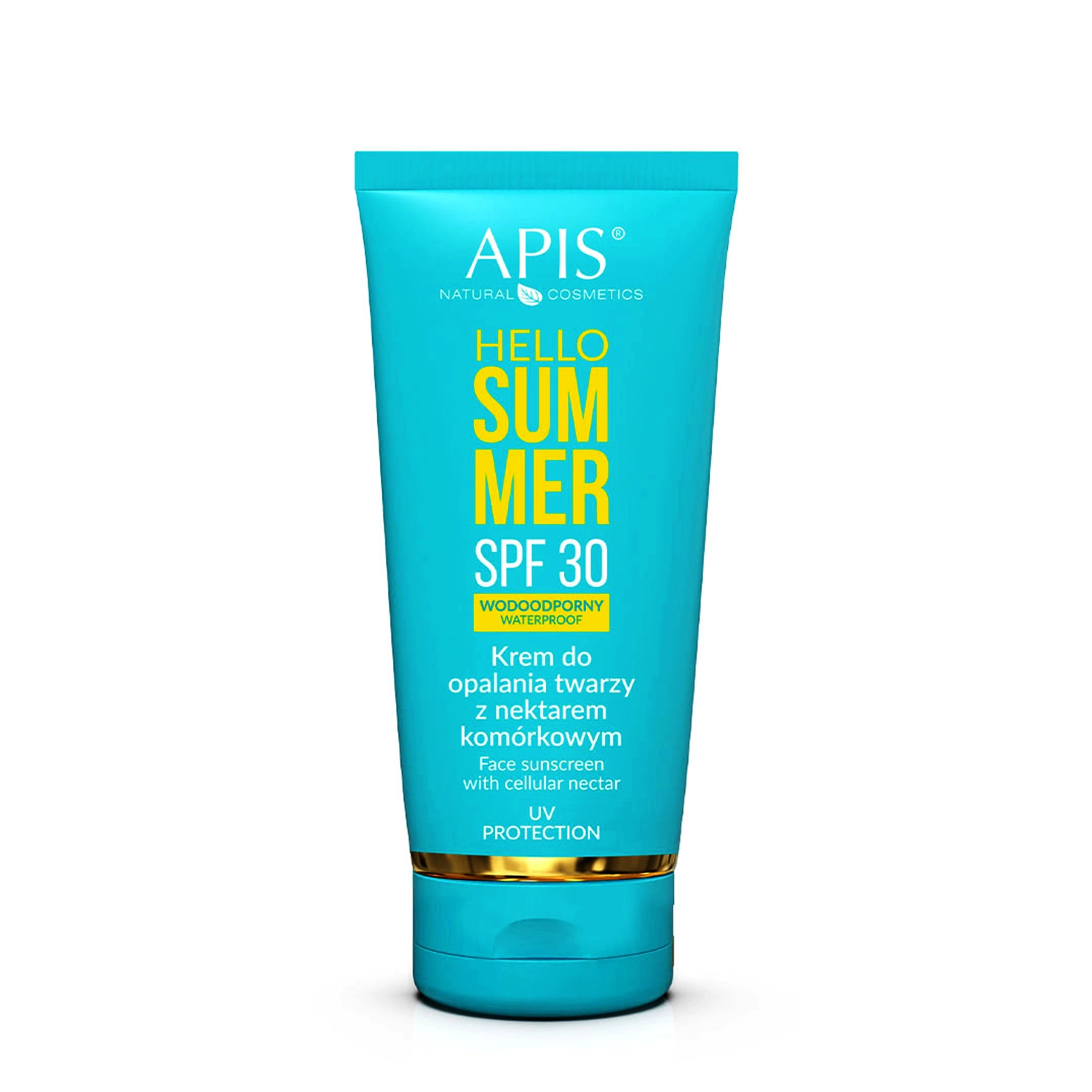 Apis - Hello Summer - Krem do Opalania Twarzy z Nektarem Komórkowym SPF30 - lekki krem z filtrami UV o szybko wchłaniającej się formule. Zapewnia ochronę przed promieniowaniem UVA i UVB, a dzięki dodatkowi nektaru komórkowego wpływa na poprawę jędrności, nawilżenia i kolorytu cery. Krem łagodzi również stany zapalne, za sprawą zawartości oleju z pestek malin. Kosmetyk naturalny.