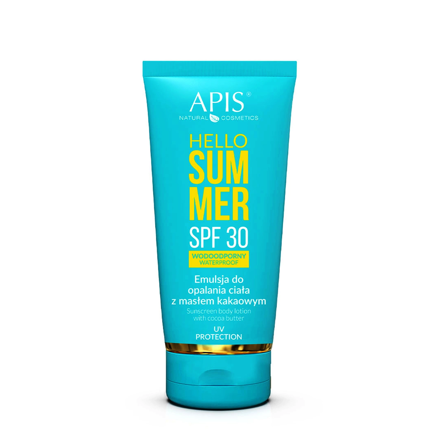 Apis - Hello Summer - Emulsja do Opalania Ciała z Masłem Kakaowym SPF30 - emulsja do ciała zapewniająca ochronę przed promieniowaniem UVA i UVB. Skład został wzbogacony o masło kakaowe, które odżywia i nawilża skórę oraz przynoszący ukojenie pantenol. Kosmetyk naturalny.