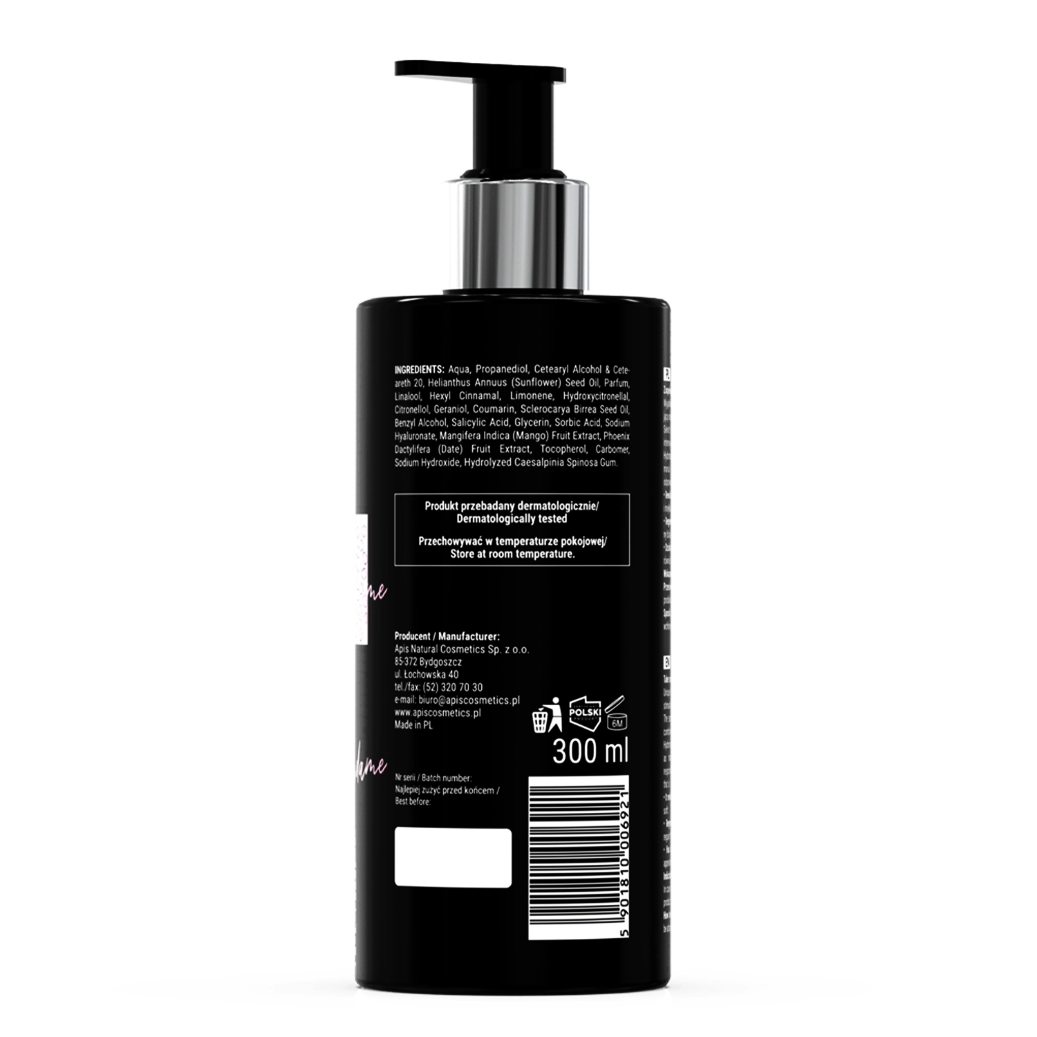 Aqua, Propanediol, Cetearyl Alcohol, Ceteareth 20, Helianthus Annuus (Sunflower) Seed Oil, Parfum, Linalool, Hexyl Cinnamal, Limonene, Hydroxycitronellal, Citrronellol, Geraniol, Coumarin, Sclerocarya Birrea Seed Oil, Benzyl Alcohol, Salicylic Acid, Glycerin, Sorbic Acid, Sodium Hyaluronate, Mangifera Indica (Mango) Fruit Extract, Phoenix Dactylifera (Date) Fruit Extract, Tocopherol, Carbomer, Sodium Hydroxide, Hydrolyzed Caesalpinia Spinosa Gum