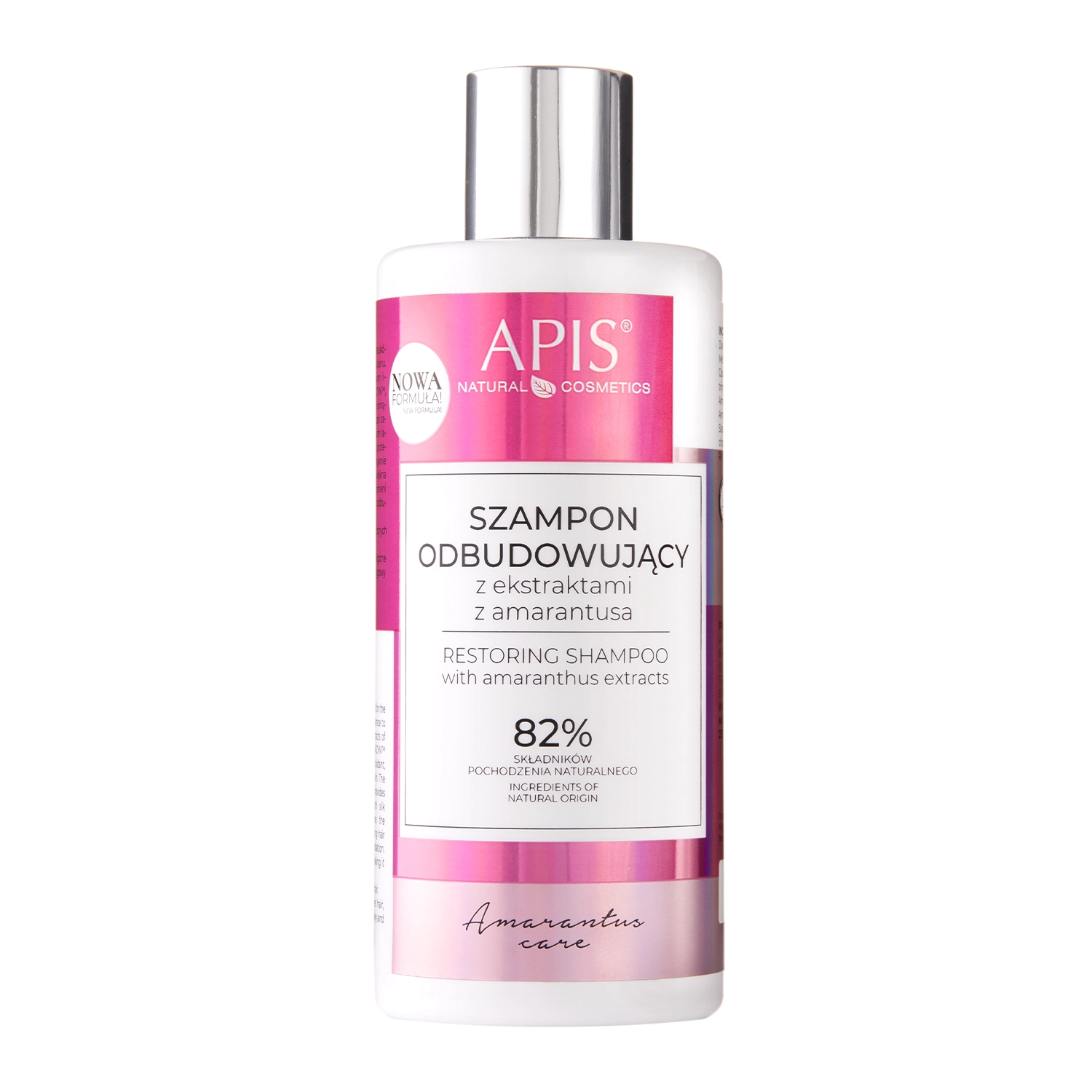 Apis - Amarantus Care - delikatny szampon odbudowujący zawierający ekstrakt z liści amarantusa, który chroni przed powstawaniem uszkodzeń mechanicznych oraz pozostawia włosy w zdrowej kondycji. Ekstrakt z nasion szarłata zawisłego zmiękcza i wygładza oraz działa ochronnie. Pantenol ma działanie nawilżające oraz łagodzące, czym nadaje włosom zdrowy wygląd i blask. Wyciąg z karczocha zwyczajnego zapobiega łamaniu włosów, zwiększa ich objętość i połysk.