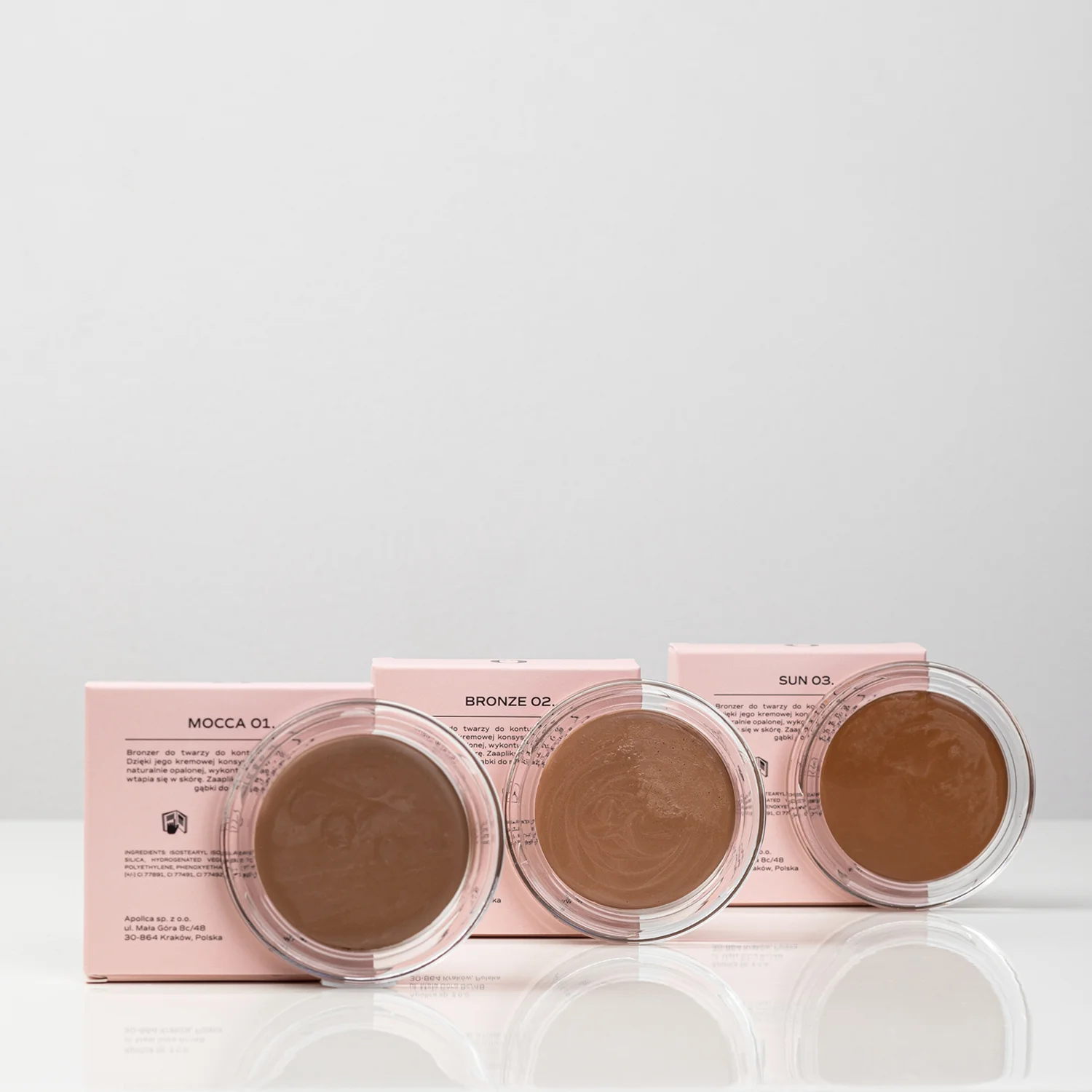 Sposób aplikacji: Aplikuj bronzer na nieprzypudrowany, mokry podkład za pomocą zwilżonej gąbeczki lub pędzla. Delikatnie wklep produkt w skórę, budując intensywność koloru według uznania. Na zakończenie utrwal makijaż pudrem.