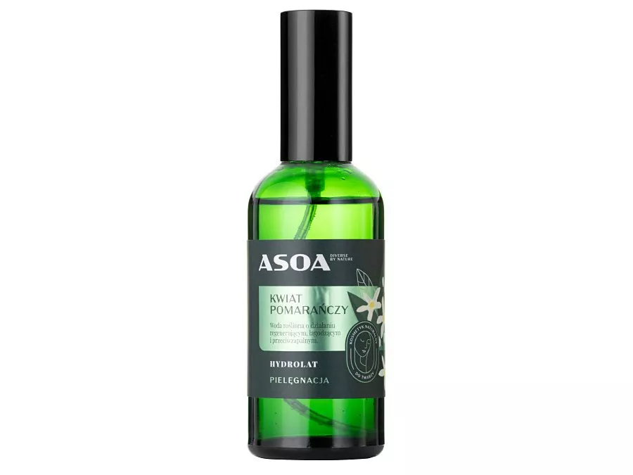 Asoa - Hydrolat z kwiatów pomarańczy - hydrolat pozyskiwany z kwiatów gorzkiej pomarańczy, który odświeża, delikatnie ściąga skórę oraz działa antybakteryjnie. Jest szczególnie polecany osobom ze skórą mieszaną, problematyczną i tłustą. Ma słodki zapach owoców pomarańczy, nie zawiera konserwantów i nie był testowany na zwierzętach.