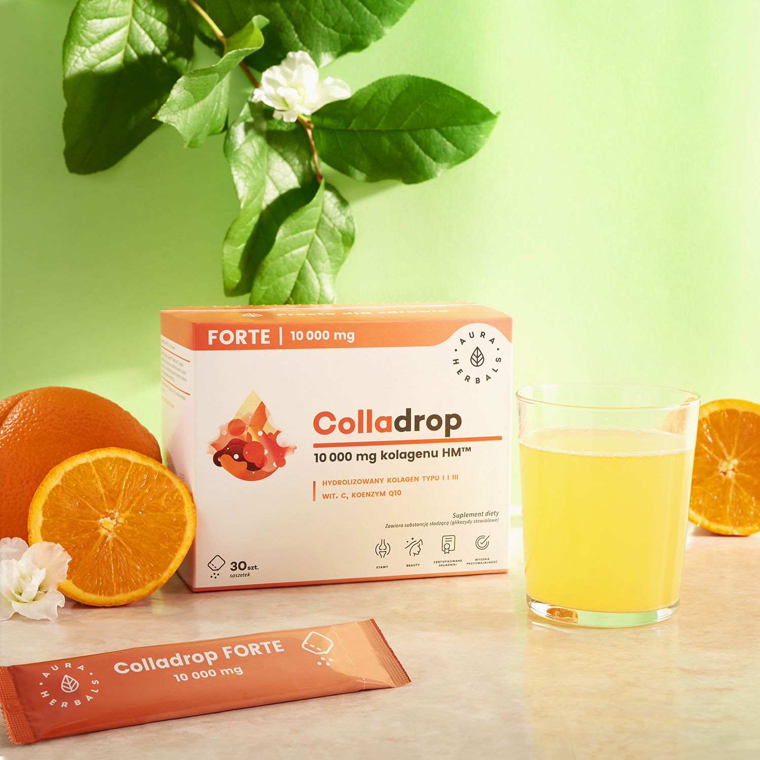 Aura Herbals - Colladrop Skin Kolagen Morski 10000 mg - Saszetki - suplement codziennej diety zawierający 10000 mg dobrze przyswajalnego, hydrolizowanego kolagenu morskiego typu I i III. Preparat wzbogacony o witaminę C i koenzym Q10, które są silnymi antyoksydantami, spowalniają procesy starzenia i zwiększają elastyczność. Nadają skórze blasku, poprawiając przy tym ogólną kondycję skóry. Produkt polecany osobom po 25. roku życia, z uwagi na malejącą naturalną produkcję kolagenu w organizmie.