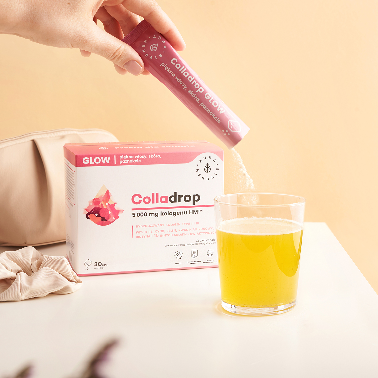 Aura Herbals - Colladrop Skin Kolagen Morski 5000 mg - Saszetki - suplement codziennej diety zawierający 5000 mg dobrze przyswajalnego, hydrolizowanego kolagenu morskiego typu I i III. Preparat wzbogacony o witaminę C i E i aż 18 aminokwasów, które wspólnie spowalniają procesy starzenia, zwiększają elastyczność i nadają skórze blasku, poprawiając przy tym ogólną kondycję skóry. Produkt polecany osobom po 25. roku życia, z uwagi na malejącą naturalną produkcję kolagenu w organizmie.