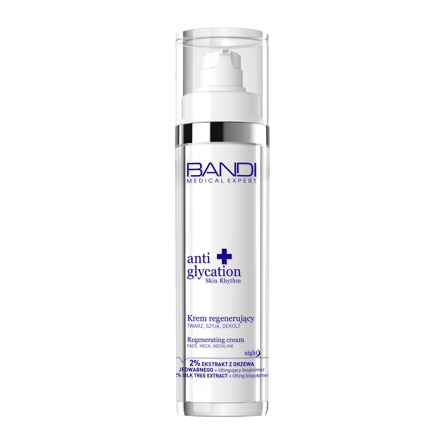 Bandi - Anti Glycation - Krem Regenerujący Twarz, Szyję i Dekolt - krem na noc do pielęgnacji skóry dojrzałej, z widocznymi przebarwieniami i utratą blasku. Wyjątkowa formuła, wzbogacona ekstraktem z drzewa jedwabnego skutecznie wpływa na poprawę jędrności oraz napięcia skóry, a alantoina wraz z ekstraktem z liści brodziuszki wiechowatej łagodzą podrażnienia, przynosząc ukojenie i wspierając procesy regeneracyjne. Kompozycja witamin C oraz E działa silnie przeciwutleniająco, chroniąc skórę przed szkodliwym wpływem wolnych rodników, jednocześnie rozjaśniając przebarwienia i przywracając cerze zdrowy, promienny blask. Systematyczne stosowanie kremu skutecznie opóźnia widoczne oznaki starzenia skóry.