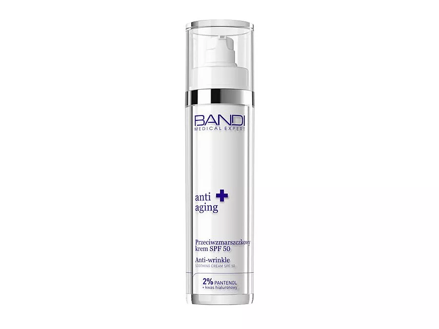 Bandi - Medical Expert - Anti Aging - Anti-Wrinkle Soothing Cream SPF50 - krem o działaniu nawilżającym i przeciwzmarszczkowym, który dzięki zawartości filtrów chemicznych chroni skórę przed promieniowaniem UV. Kwas hialuronowy wiąże wodę w naskórku i zapewnia optymalny poziom nawilżenia, a także wygładza skórę. Dodatek alantoiny i pantenolu działa nawilżająco, łagodząco, kojąco i uelastyczniająco. Z kolei witamina E jest antyoksydantem, spowalnia procesy starzenia się skóry. Produkt zalecany do codziennego stosowania, przeznaczony dla każdego rodzaju skóry, w szczególności skór suchych i dojrzałych.