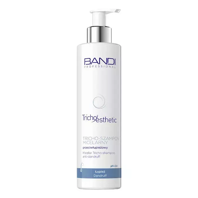 Bandi - Tricho-Szampon - Micelarny Przeciwłupieżowy - szampon trychologiczny do włosów skłonnych do występowania łupieżu. Micele obecne w produkcie oczyszczają skórę głowy i włosy z zanieczyszczeń oraz sebum. Zawarty w nim ekstrakt z mięty pieprzowej skutecznie redukuje łupież i stany zapalne, a także odświeża skórę głowy i wygładza włosy. Hydrolizowany jedwab regeneruje, nawilża i zapobiega elektryzowaniu się włosów, a alantoina łagodzi i koi wrażliwą skórę głowy.