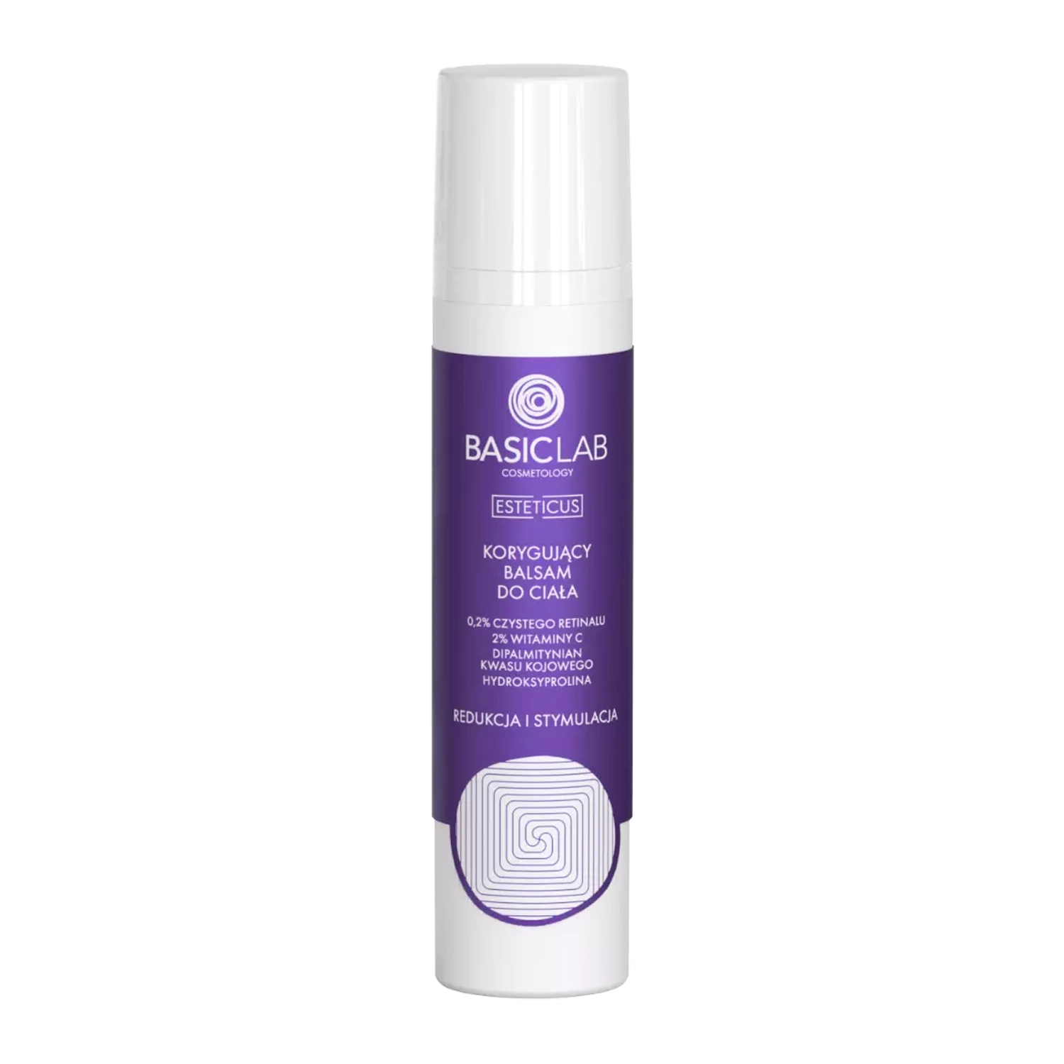 BasicLab -  Redukcja i Stymulacja - korygujący balsam do ciała na noc. Zawiera 0,2% czystego retinalu w stabilnej formie. Stymuluje procesy odnowy skóry, ujędrnia oraz redukuje niedoskonałości, blizny i przebarwienia. Zawiera skuteczne składniki aktywne, takie jak witamina C 2%dipalmitynian kwasu kojowego, czy hydroksyprolina, które działają rozjaśniająco i wygładzająco. Balsam delikatnie złuszcza naskórek, redukując szorstkość i chropowatość. Zmniejsza problem z wrastającymi włoskami, rozszerzonymi porami i nierównym kolorytem. Może być stosowany na całe ciało, w tym: dekolt, ramiona, plecy, brzuch, nogi, pośladki oraz okolice bikini. Produkt nie zawiera dodatków zapachowych. Jest wegański.