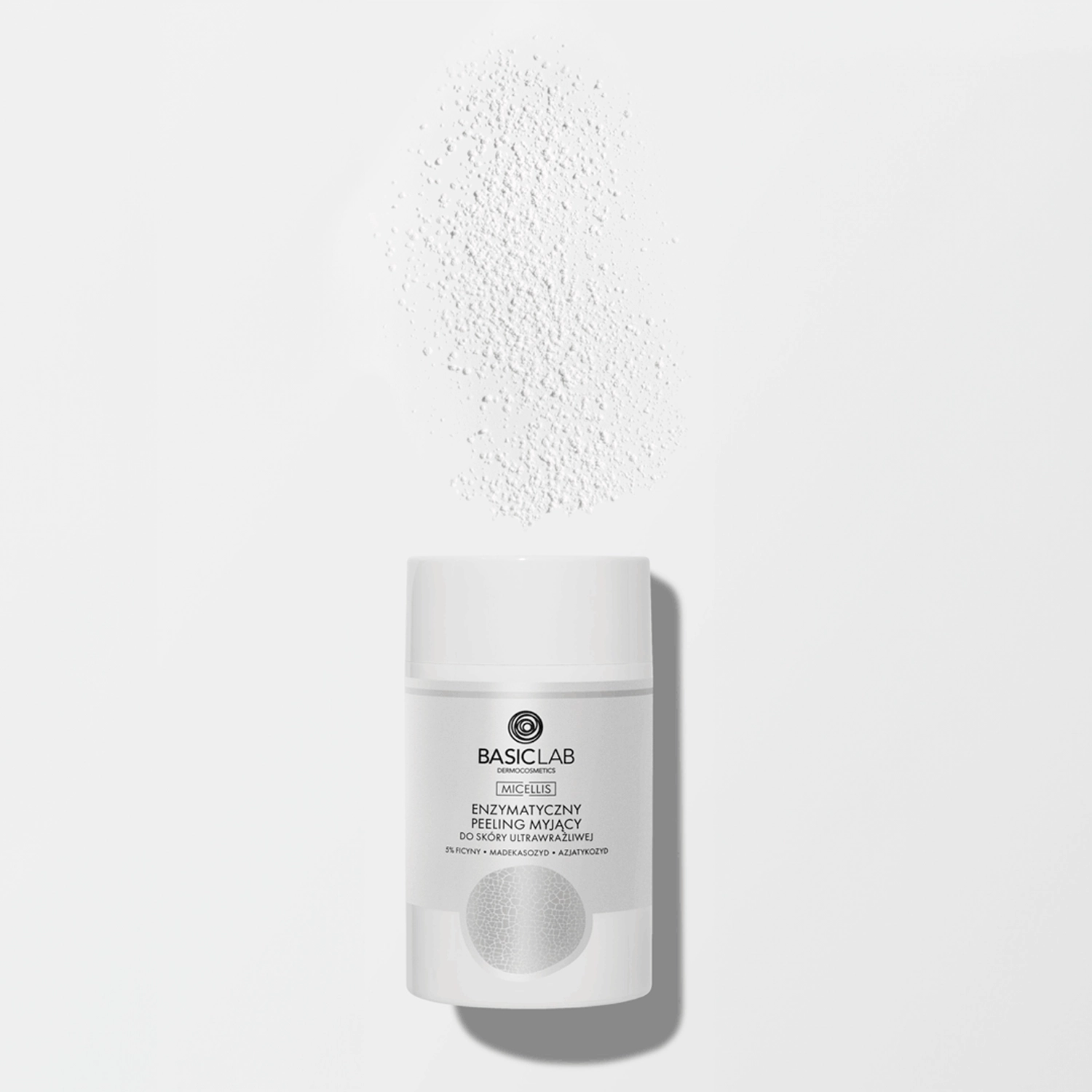 BasicLab - Micellis - peeling enzymatyczny do mycia skóry ultrawrażliwej o pudrowej konsystencji. Produkt wpływa pozytywnie na efektywne wygładzenie skóry, redukcje suchych skórek i nadaje naturalny, zdrowy blask. Kosmetyk nie narusza bariery hydrolipidowej, głęboko oczyszcza cerę, a dzięki ficynie działa złuszczająco i wygładzająco. Peeling zawiera również substancje wyizolowane z wąkroty azjatyckiej, takie jak madekasozyd i azjatykozyd, które skutecznie zmniejszają nadreaktywność na podrażnienia i zaczerwienienia. Dodatkowo fruktoza, glukoza i inulina wzmacniają barierę ochronną skóry, a całość dopełnia rozjaśniający kwas azelainowy. Odpowiedni dla wegan.