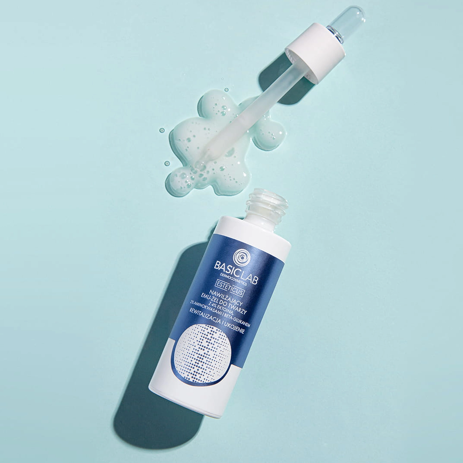 BasicLab - Esteticus - Rewitalizacja i Ukojenie - Nawilżający Emu-Żel do Twarzy z 4% Ektoiną, Aminokwasami i Beta-Glukanem - serum do twarzy o działaniu nawilżająco-rewitalizującym. Zawarta w produkcie ektoina, glukonolakton i trehaloza zapewnia silne i długotrwałe nawilżenie skóry. Ceramidy wspomagają odbudowę i ochronę bariery hydrolipidowej, a beta-glukan skutecznie łagodzi podrażnienia oraz koi skórę.