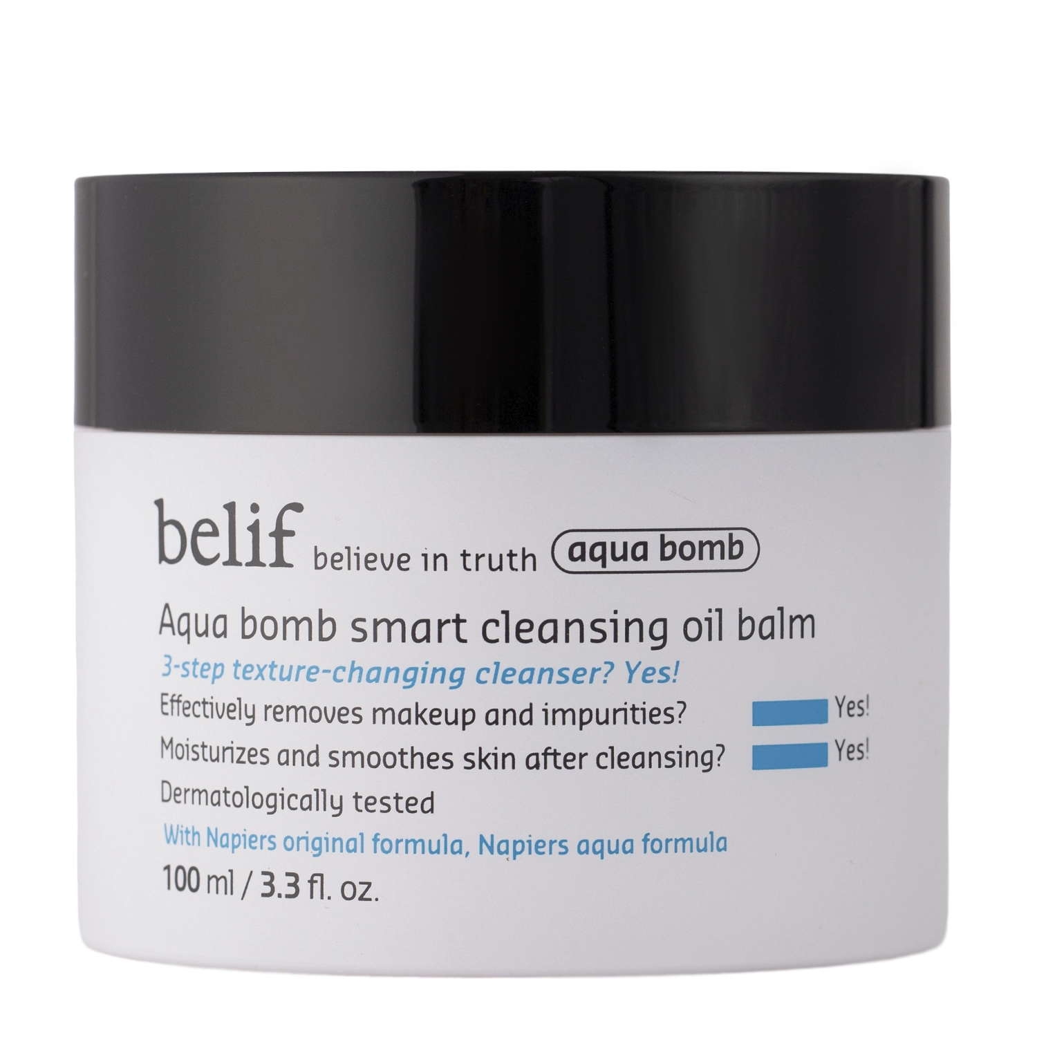 Belif - Aqua Bomb Smart Sleansing Oil Balm  - balsam do I etapu oczyszczania skóry. Skutecznie rozpuszcza i zmywa makijaż, zanieczyszczenia oraz pielęgnację, zmienia się w olejek pod wpływem ciepła i masażu. W składzie znajduje się olej jojoba, który zmiękcza i wygładza skórę, a także ekstrakt z korzenia kurkumy, działający przeciwzapalnie i antybakteryjnie. Formułę tworzą również ekstrakt z nasion owsa, czyli popularny antyoksydant i substancja łagodząca oraz ekstrakt z kwiatów nagietka, który wspiera procesy regeneracji. Dodatek olejków z mięty polnej i zielonej wzmacnia działanie łagodzące balsamu myjącego.
