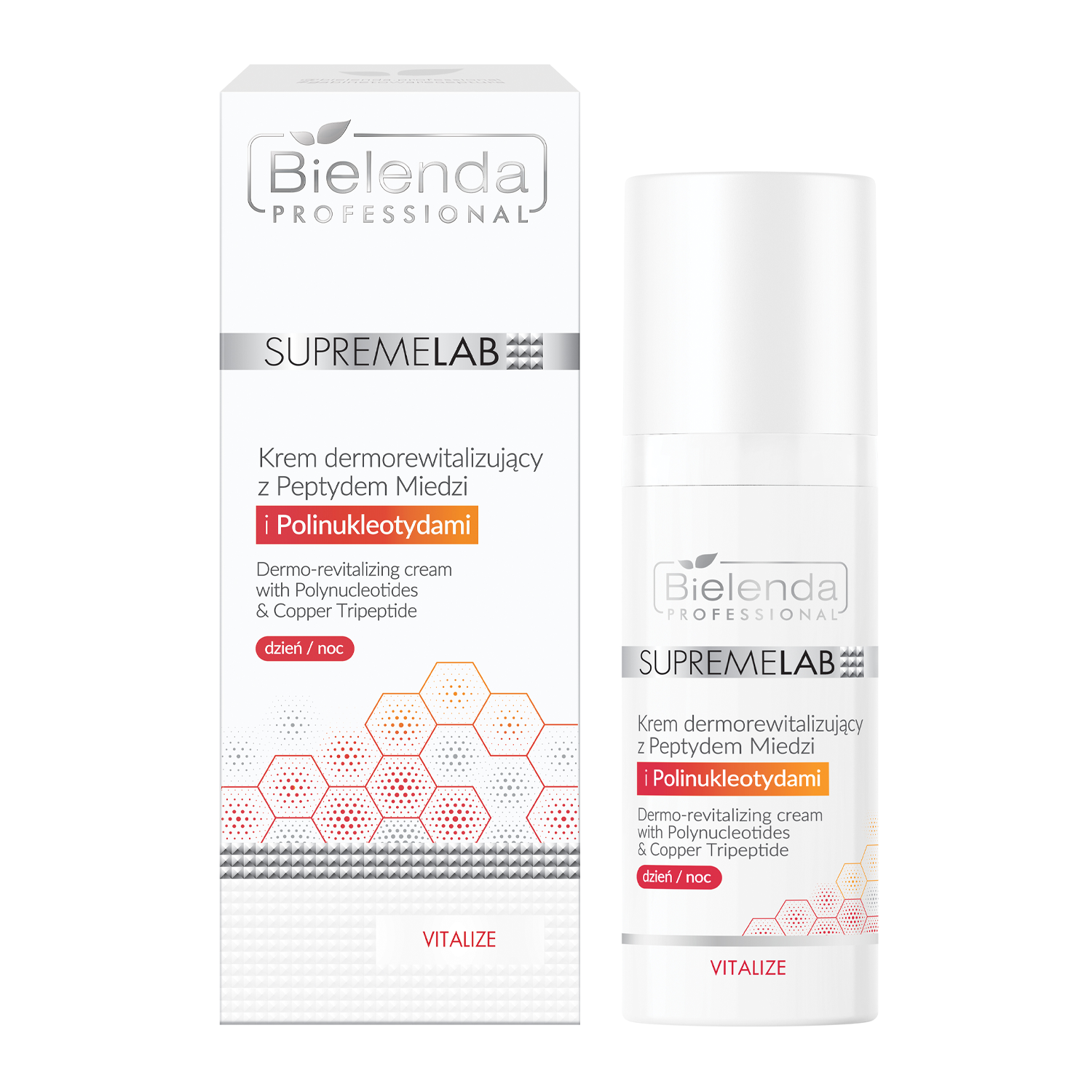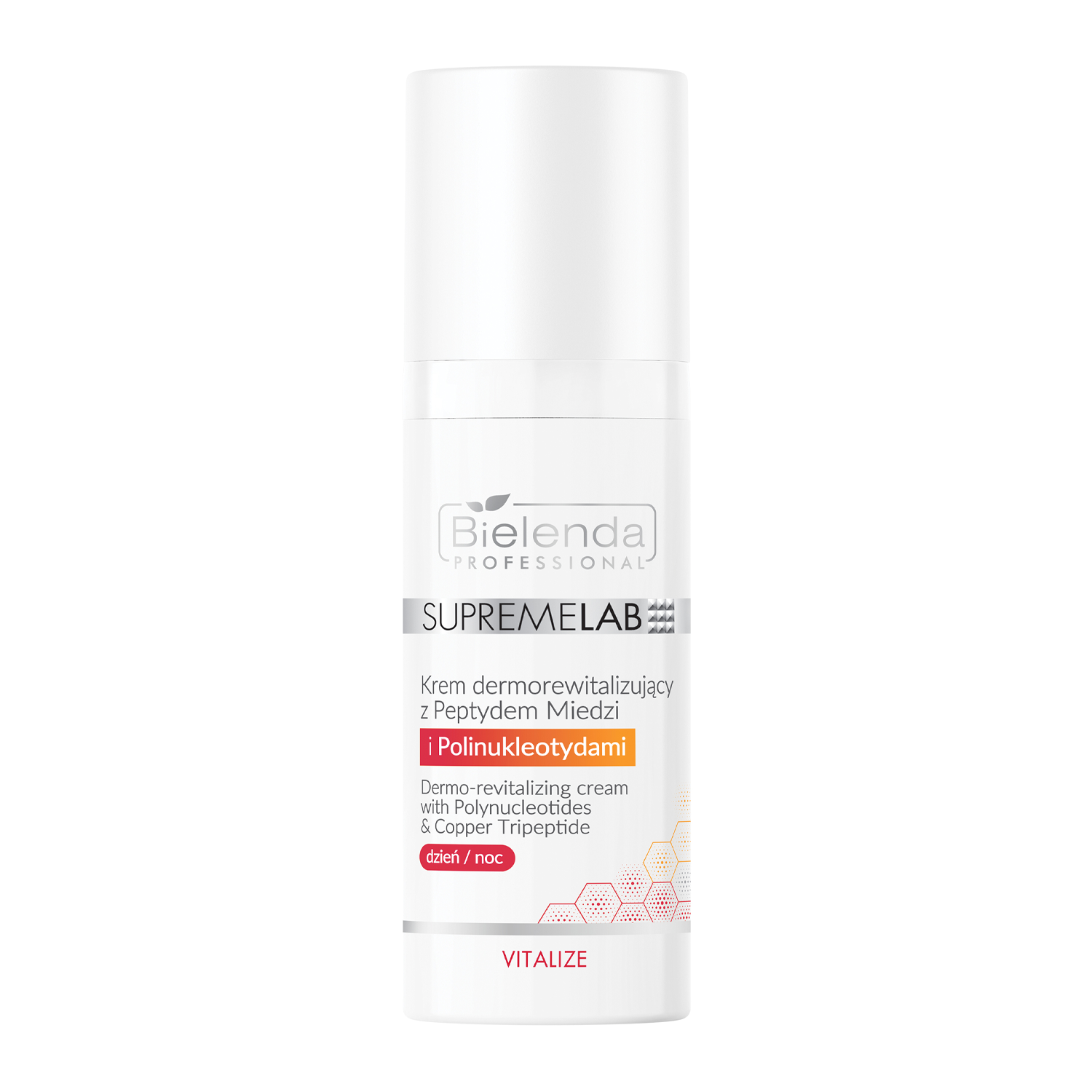 Bielenda Professional - Supremelab - Krem Dermorewitalizujący z Peptydem Miedzi i Polinukleotydami - krem do twarzy przeznaczony do zwalczania oznak starzenia i poprawy jędrności skóry. Zapewnia promienny wygląd cerze i wyrównuje jej koloryt. Zawiera peptyd miedzi oraz polinukleotydy o działaniu ujędrniającym i spowalniającym starzenie. Witamina C poprawia koloryt i kondycję skóry, przywracając blask. Z kolei olej jojoba odżywia, a glukonolakton dba o nawilżenie.