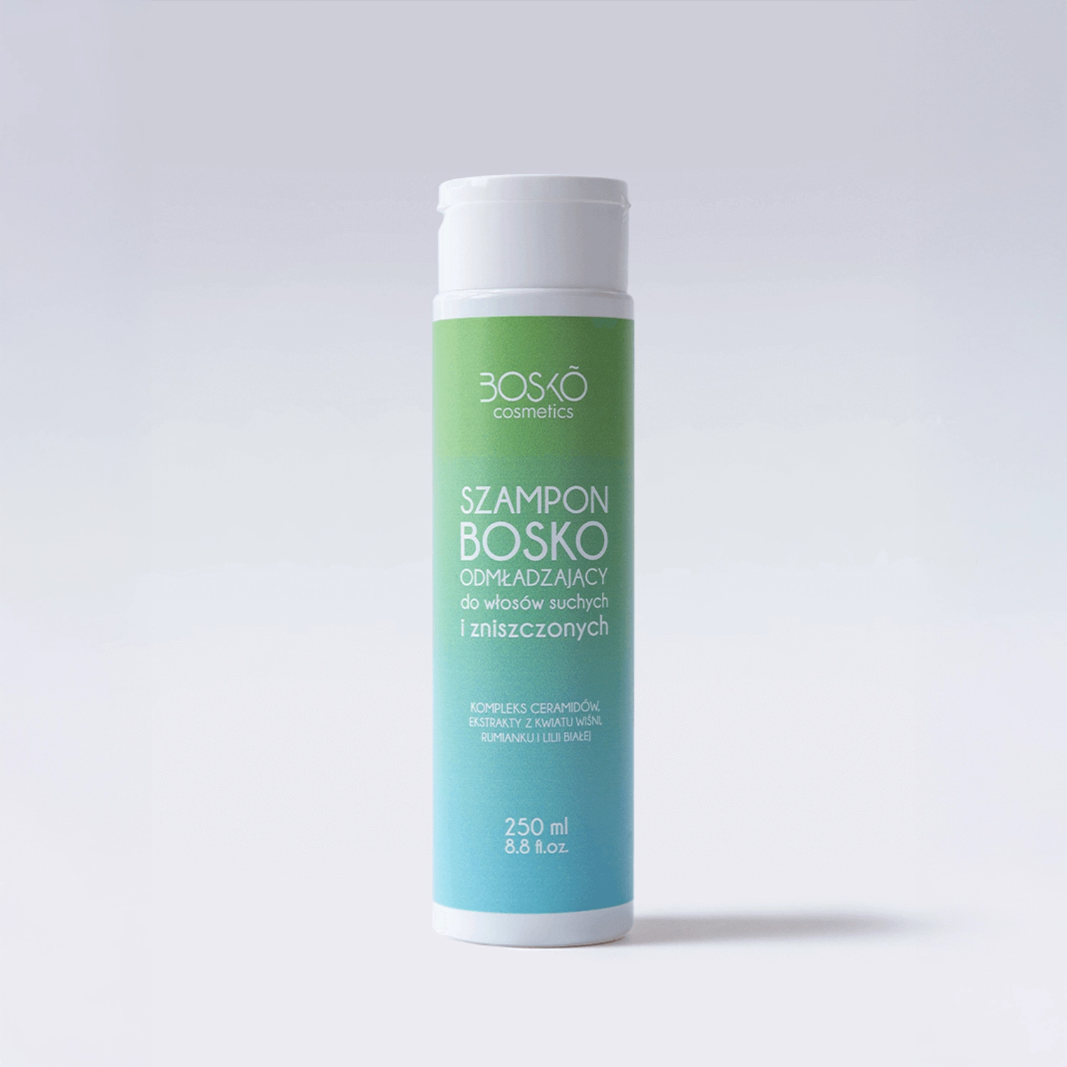 Szampon BOSKO Odmładzający - szampon do włosów rekomendowany dla każdego typu skóry głowy, w szczególności tej suchej i podrażnionej. Zawiera kompleks 5 ceramidów, które otulają włos i naskórek odżywczą warstwą okluzyjną, zapewniając łodydze włosa pożądaną miękkość oraz gładkość. Dodatek systemu lamelarnego odpowiada za regenerację uszkodzeń, a Saccharide Isomerate silnie nawilża zarówno naskórek jak i pasma włosów. Kompozycję uzupełnia prebiotyczny ferment ryżowy, który dba o mikrobiom skórny i minimalizuje podrażnienia, a także regulujący glukonolakton. Szampon doskonale oczyszcza skórę głowy i włosy u nasady, a ponadto łagodzi, przywraca odpowiedni poziom nawilżenia, wspiera florę mikrobiologiczną i stymuluje odnowę komórkową.