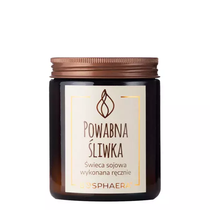 Bosphaera - Świeca Sojowa - Powabna Śliwka - naturalna, ekologiczna, ręcznie wykonana świeca z wosku sojowego o zapachu śliwki z miodem, który otula i pozwala się zrelaksować po ciężkim dniu. Zawiera drewniany knot oddający dźwięki letniego ogniska w czasie palenia. Świeca znajduje się w ekologicznym, eleganckim, ciemnym szkle, który w łatwy sposób można wyczyścić po zużyciu oraz ponownie wykorzystać.