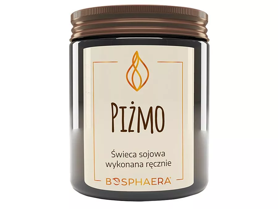 Bosphaera - Świeca Sojowa - Piżmo - naturalna, ekologiczna, ręcznie wykonana świeca z wosku sojowego o zapachu piżma, który ma charakterystyczny zapach kojarzący się z luksusem. Zawiera drewniany knot oddający dźwięki letniego ogniska w czasie palenia. Świeca znajduje się w ekologicznym, eleganckim, ciemnym szkle, który w łatwy sposób można wyczyścić po zużyciu oraz ponownie wykorzystać. Przyjemny zapach świecy sprawdzi się do palenia szczególnie w łazience czy salonie kosmetycznym.