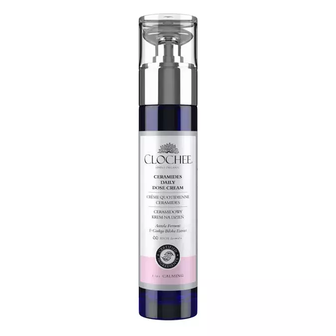 Clochee - Ceramides Daily Dose Cream - odżywczy krem do codziennej pielęgnacji twarzy. Działa kojąco i wzmacniająco na skórę dzięki zawartości ceramidu, skwalanu i oleju awokado. Dodatkowo pantenol dzięki swoim właściwościom przeciwzapalnym wspiera naturalne procesy regeneracyjne. Produkt fermentacji bakterii mlekowych wraz z sokiem z kokosa nawilżają skórę i działają antyoksydacyjnie, przez co niwelują wolne rodniki i spowalniają procesy starzenia. Krem poprawia poziom nawilżenia skóry i wzmacnia jej kondycję oraz wspiera regenerację np. po przejściu licznych niedoskonałości i stanów zapalnych. W 97,6% składa się z surowców pochodzenia naturalnego.