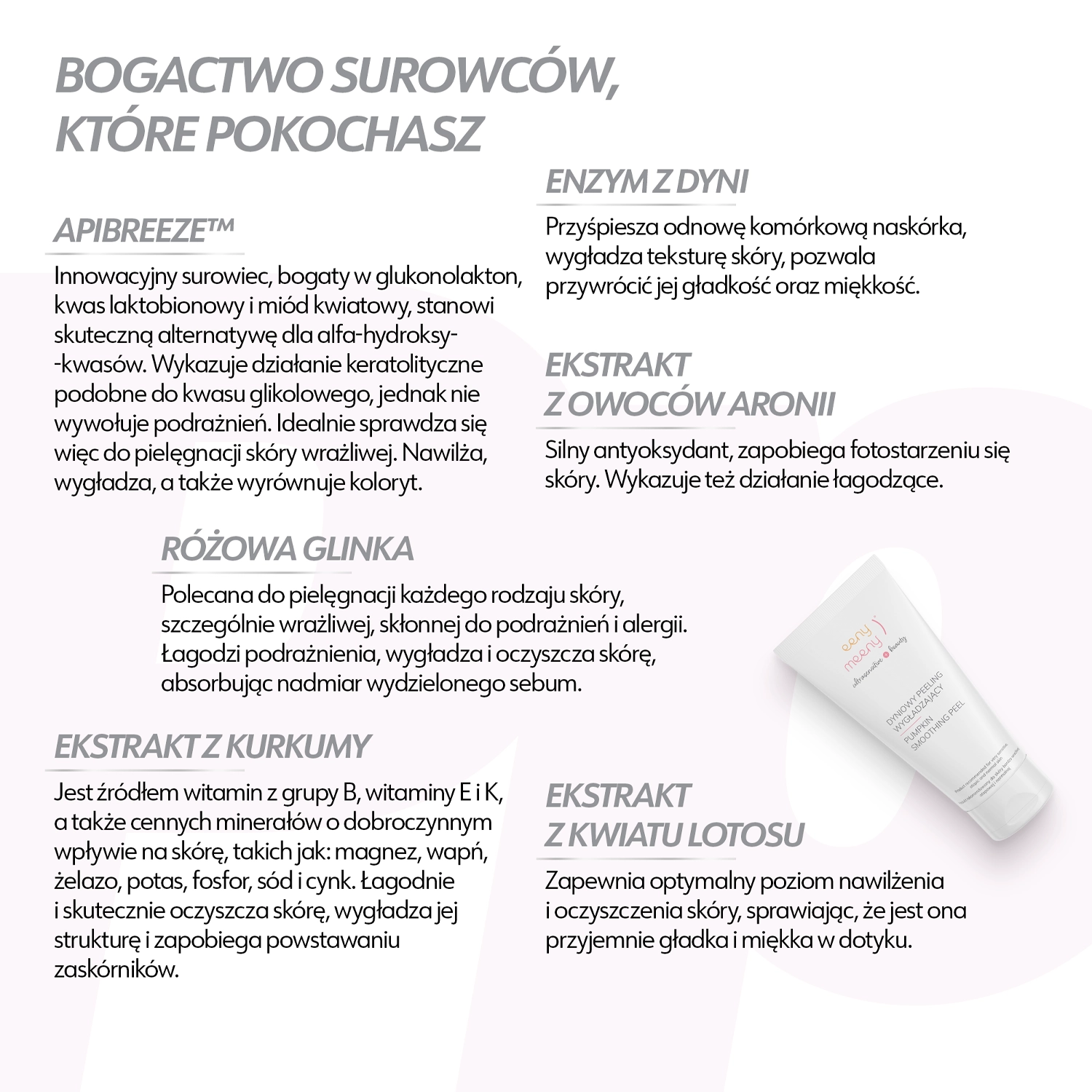 Eeny Meeny - Pumpkin Smoothing Peel - Dyniowy Peeling Wygładzający - delikatny peeling do twarzy odpowiedni dla skór wrażliwych, a także bezpieczny do stosowania w trakcie ciąży i w okresie karmienia piersią. Funkcję złuszczającą pełni innowacyjny surowiec APIBREEZE™, w którego skład wchodzi glukonolakton, kwas laktobionowy i miód kwiatowy. Kompleks ten usuwa martwy naskórek, dzięki czemu wygładza skórę, jednocześnie nie powodując podrażnień. Dodatek enzymu z dyni wspomaga efekt wygładzenia struktury skóry i przyspiesza odnowę komórkową. Z kolei różowa glinka działa oczyszczająco, kojąco i odświeżająco. Ekstrakt z kurkumy ma właściwości antyoksydacyjne i przeciwzapalne, a olej ryżowy nawilża oraz łagodzi zmiany skórne.