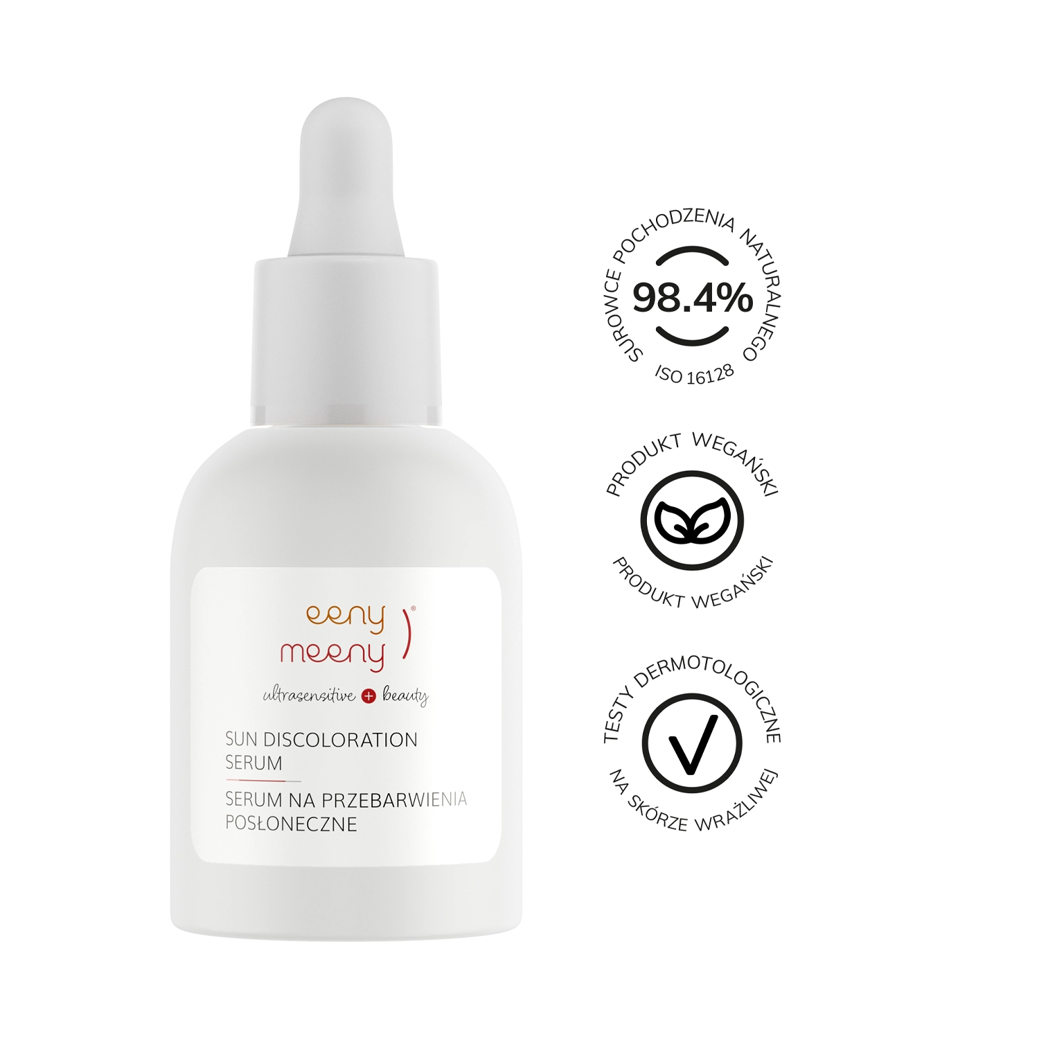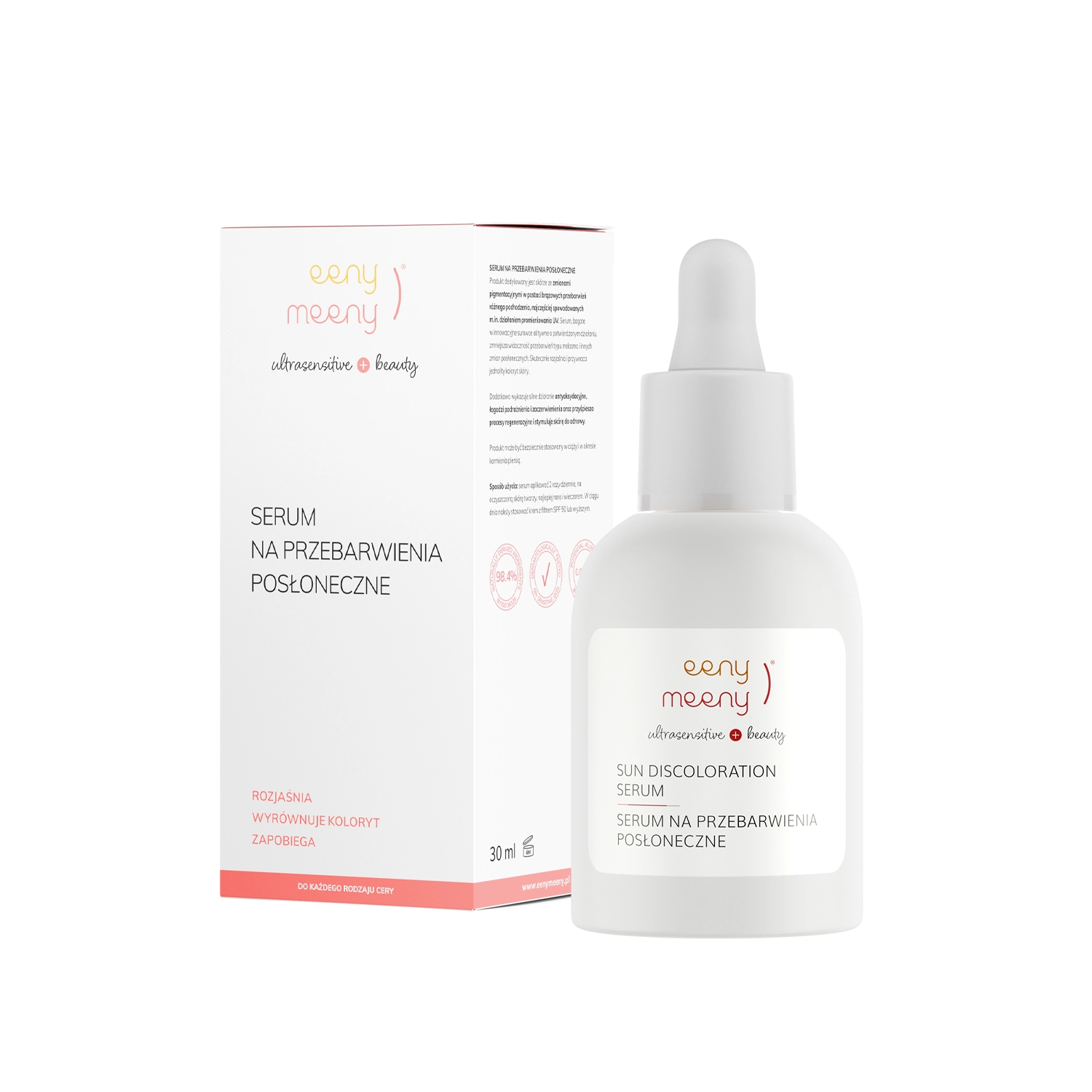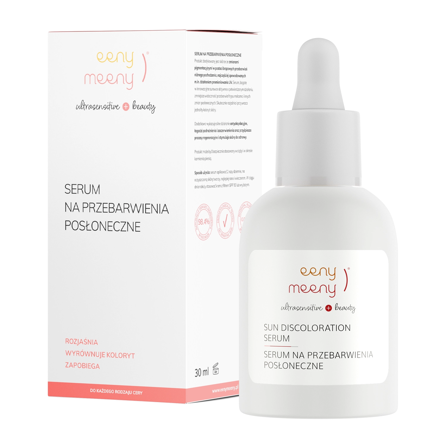 Eeny Meeny - Sun Discoloration Serum - Serum na Przebarwienia Posłoneczne - serum do twarzy, dedykowane skórom z przebarwieniami posłonecznymi, czyli brązowymi zmianami pigmentacyjnymi. Formułę skomponowano z innowacyjnych surowców, między innymi LIGHTDERM GLY oraz EPS BRIGHT PA, które mają udowodnione działanie rozjaśniające i wybielające, dzięki czemu ujednolicają koloryt skóry. To działanie wspomaga ekstrakt ze śliwki kakadu, który jest bogaty w witaminę C. Z kolei ekstrakt z kory wierzby białej złuszcza warstwę rogową naskórka. Kwas hialuronowy poprawia poziom nawilżenia. Serum jest przyjazne weganom i skomponowane z 98,4% składników pochodzenia naturalnego. Może być stosowane przez kobiety w ciąży i karmiące piersią.