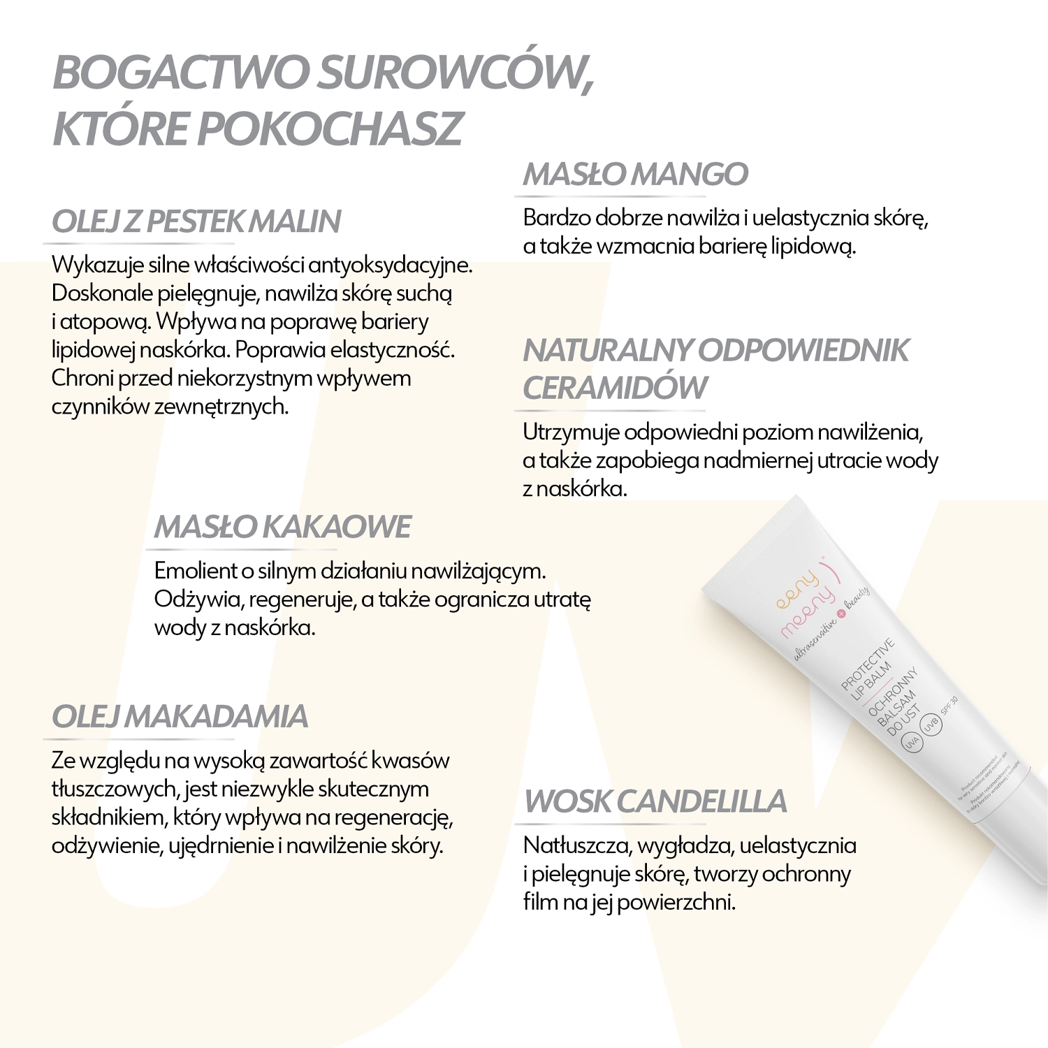 Eeny Meeny - Protective Lip Balm - balsam do ust. Zawiera filtry chemiczne, które wspomagają ochronę przed promieniowaniem UVA i UVB oraz składniki nawilżające takie jak: hialuronian sodu, olej z pestek malin, masło kakaowe i wosk candelilla. Utrzymują utracie wody z naskórka i przyspieszają proces regeneracji, pozostawiając usta aksamitnie miękkie i odżywione. Formuła produktu jest wegańska.