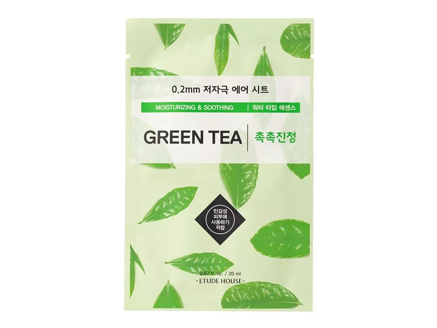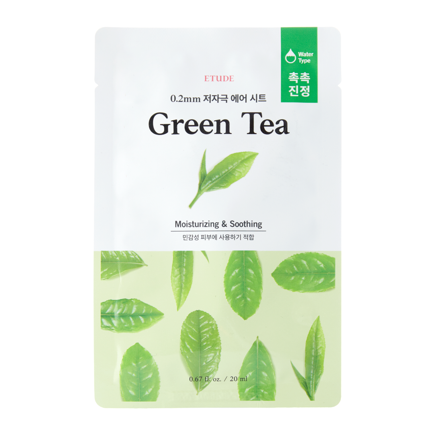 ETUDE HOUSE - 0.2mm Therapy Air Mask - Green Tea - maska w płacie o działaniu oczyszczająco-odświeżającym, zanurzona w esencji bogatej w składniki aktywne. Jej skład opiera się na ekstrakcie z zielonej herbaty, który odświeża i działa przeciwzapalnie, a także na ekstrakcie z lukrecji gładkiej, który łagodzi podrażnienia i przyspiesza regeneracje skóry. Dzięki składnikom nawilżającym, takim jak mocznik, hialuronian sodu oraz alantoina skóra jest wyraźnie wygładzona. Płat maski jest bardzo cienki i idealnie dopasowuje się do kształtów twarzy.