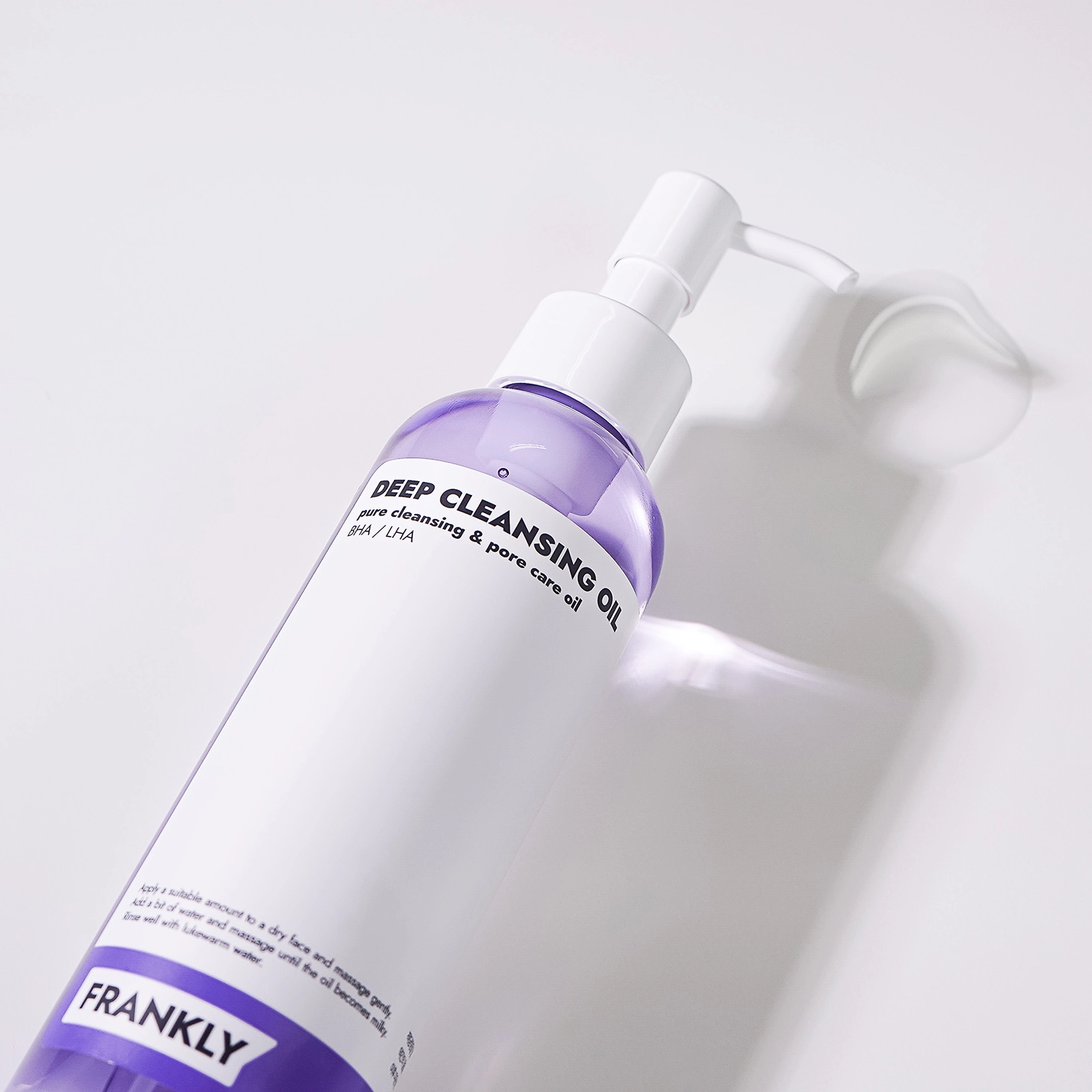 Frankly - Deep Cleansing Oil - olejek do demakijażu twarzy. Skutecznie usuwa makijaż, sebum, kremy z filtrem SPF i zanieczyszczenia, a także martwe komórki naskórka, nadając skórze promienny blask dzięki obecności kwasów BHA i LHA w składzie. Bazuje na mieszance olejów roślinnych, które łączą się z zanieczyszczeniami, łojem i pielęgnacją, zapewniając skuteczny demakijaż. Olejek został wzbogacony o kwas salicylowy oraz jego pochodną, dzięki czemu ma właściwości wygładzające, natomiast aminokwasy, kwas hialuronowy oraz pantenol dbają o to, by skóra nie wysuszyła się podczas oczyszczania oraz łagodzą podrażnienia. Obecność emulgatora w składzie sprawia, że olejek wytwarza w kontakcie z wodą emulsję, co usprawnia zmycie go ze skóry. Produkt nie posiada kompozycji zapachowej, a jego formuła jest wegańska.