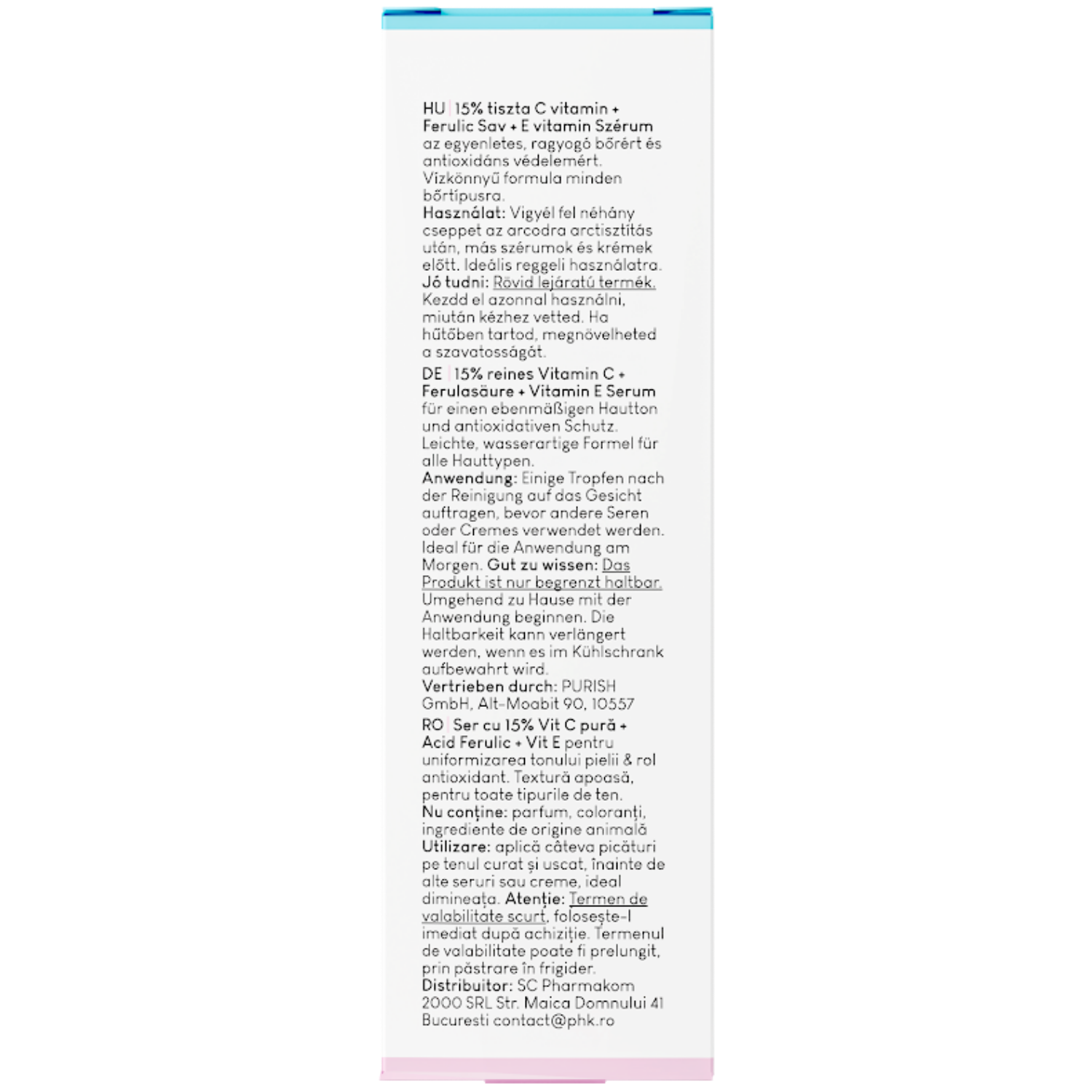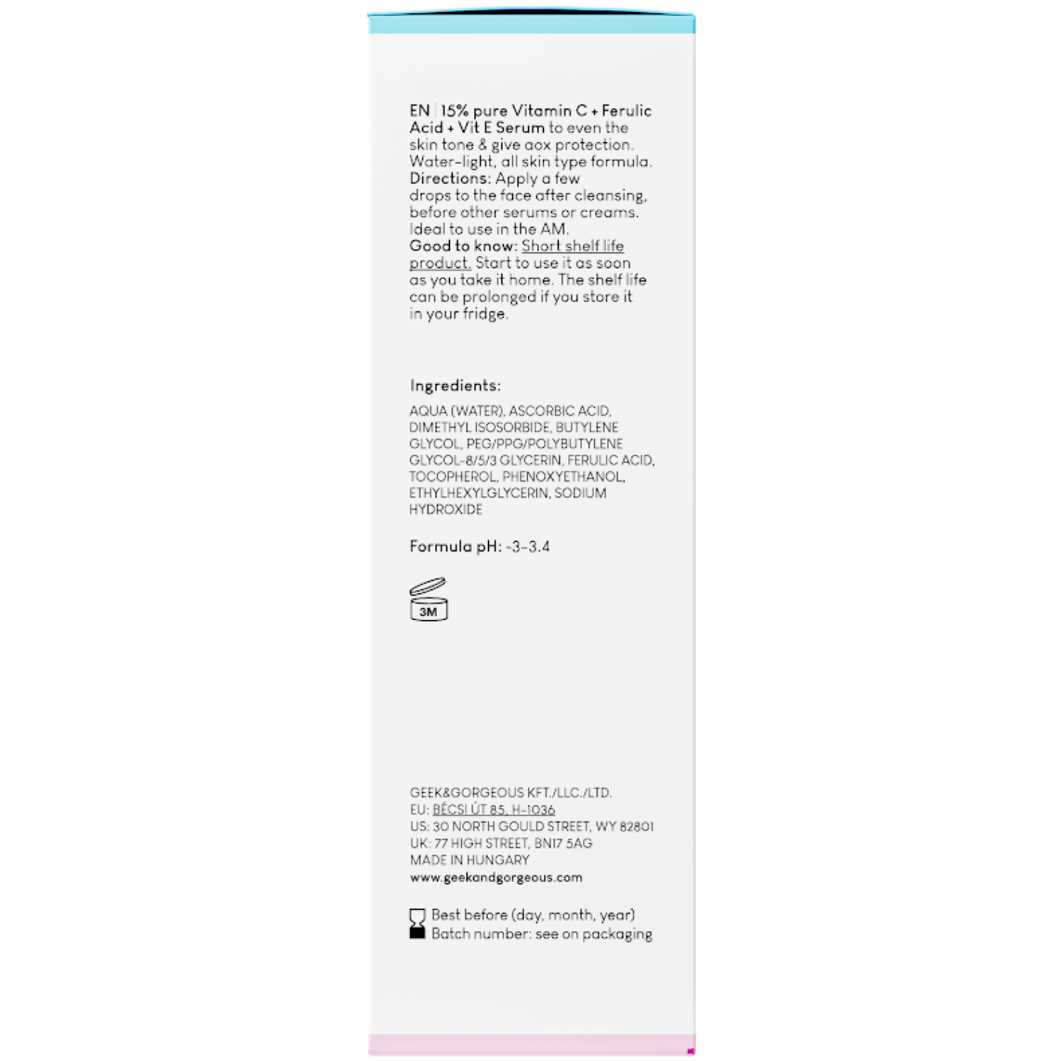 - przeciwzmarszczkowe serum zawierające trzy składniki o silnym działaniu antyoksydacyjnym. Witamina C w stężeniu 15% oprócz zwalczania wolnych rodników, wpływa na syntezę kolagenu, opóźniając procesy starzenia się skóry, oraz wyrównuje jej koloryt, zmniejszając widoczność przebarwień. Serum zostało wzbogacone o kwas ferulowy i witaminę E, które również są przeciwutleniaczami i wpływają na stabilność witaminy C i wspomagają jej działanie. Serum posiada lekką, wodną formułę i szybko się wchłania. Ma pH równe 3,2-3,4. Odpowiednie jest do każdego rodzaju skóry, która potrzebuje antyoksydacji i wyrównania kolorytu, z wyjątkiem skóry wrażliwej, na którą stężenie kwasu askorbinowego i niskie pH produktu mogą działać drażniąco. Kosmetyk jest wegański.