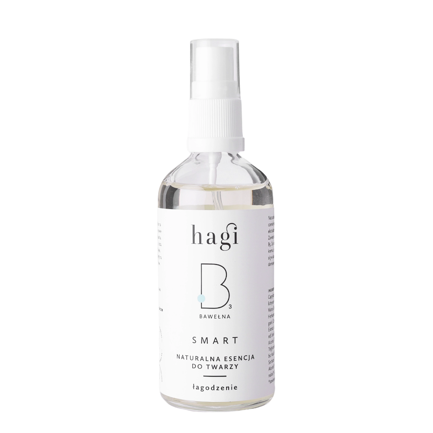Hagi - Smart B - Naturalna Esencja do Twarzy - Łagodzenie - tonik-esencja do pielęgnacji skór szukających ukojenia. Zawiera pantenol i ekstrakt z bawełny, które skutecznie łagodzą podrażnienia, hydrolat z kocanki o działaniu przeciwzapalnym oraz wyrównującą koloryt cery witaminę C.