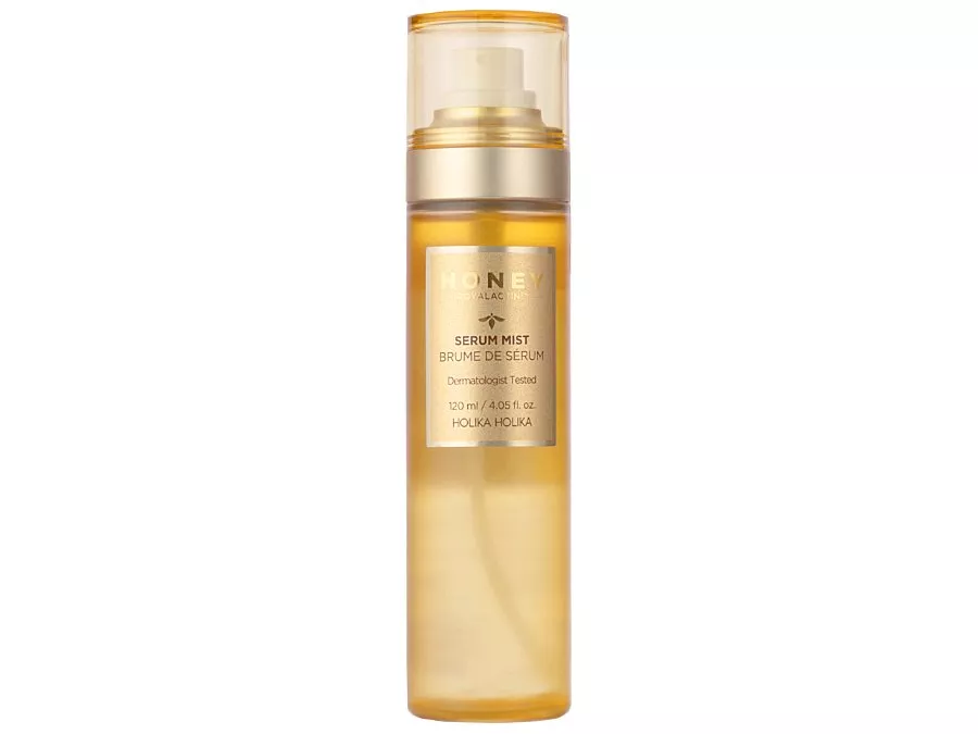 Holika Holika - Honey Royalactin Serum Mist - dwufazowa mgiełka do każdego rodzaju skóry. Zawiera niacynamid, który reguluje pracę gruczołów łojowych, działa antyoksydacyjnie, przeciwzapalnie i rozjaśniająco oraz miód o działaniu nawilżającym i regenerującym. Ekstrakt z korzenia kurkumy wykazuje właściwości antybakteryjne, przeciwzapalne i przeciwrodnikowe, adenozyna dodatkowo ujędrnia i uelastycznia, a ekstrakt z neem łagodzi podrażnienia i działa antybakteryjnie. Mgiełka uzupełnia lipidy na skórze, chroniąc ją przed przesuszeniem, napina i wygładza, a także poprawia jej regenerację i niweluje podrażnienia.