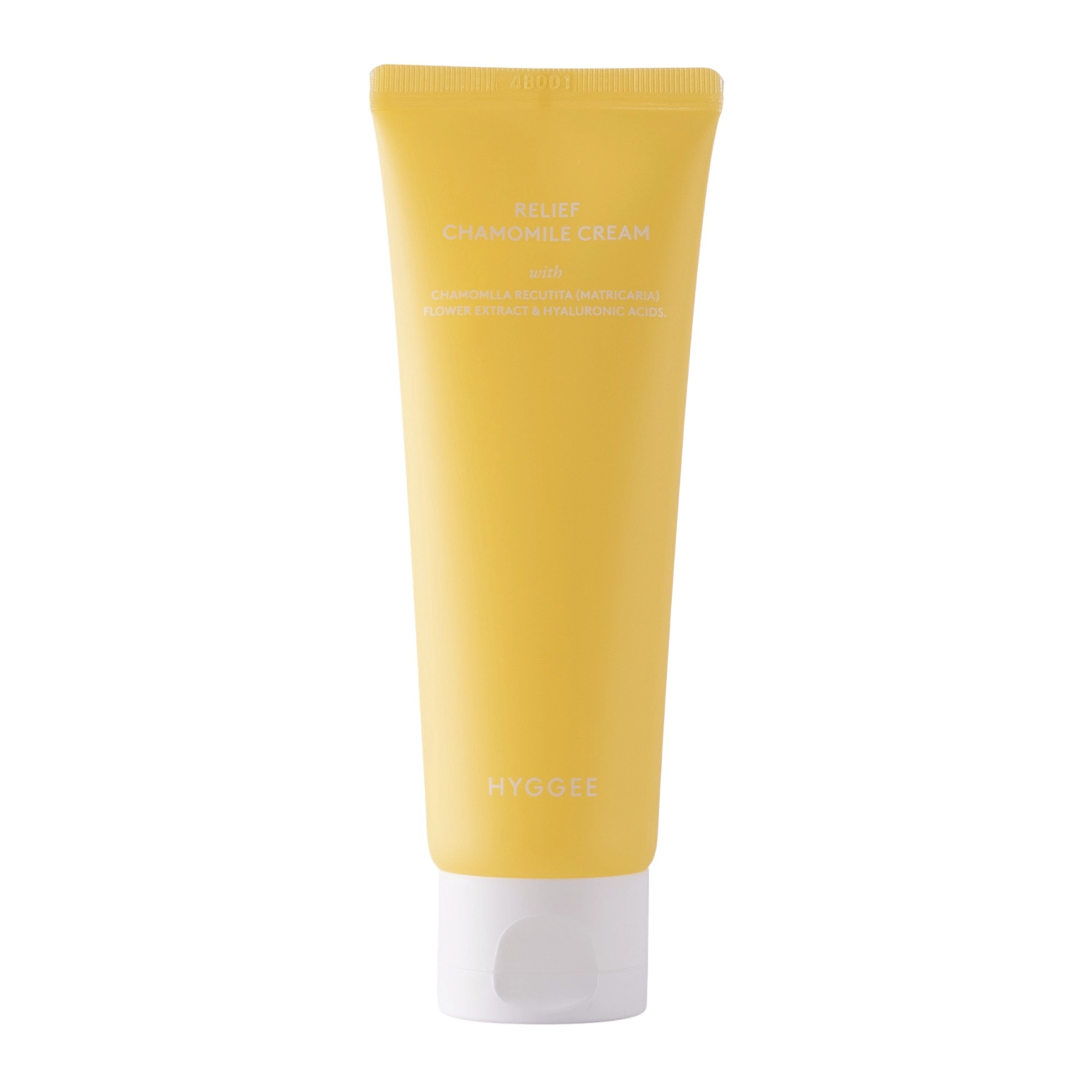 Hyggee - Relief Chamomile Cream krem o działaniu otulającym skórę i łagodzącym podrażnienia. Odpowiedni jest do każdego rodzaju skóry, ale jego właściwości najbardziej docenią skóry suche, podrażnione i wrażliwe. W składzie znajduje się ekstrakt z kwiatów rumianku i ekstrakt z wąkroty azjatyckiej zapewniające odpowiedni poziom nawilżenia i działanie  łagodzące. Krem zawiera również kwas hialuronowy i hialuronian sodu dbające o wygładzenie, nawilżenie oraz wspierające proces regeneracji skóry. Dodatek betainy dopełnia właściwości nawilżające i wzmacniające produktu. Posiada lekką, sprawnie wchłaniającą się konsystencję.