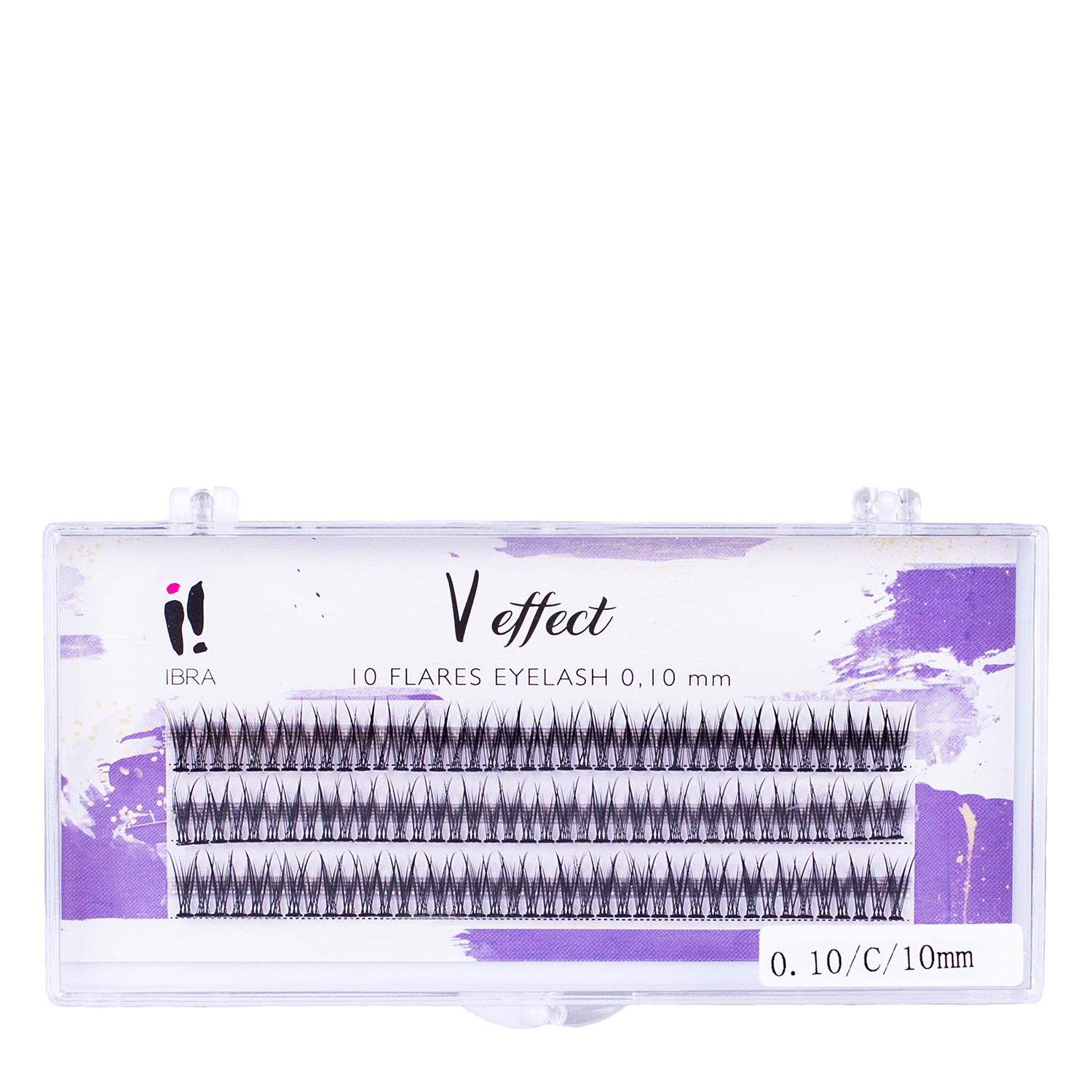 Ibra Makeup - Kępki V Effect 0,10 - 10mm - kępki rzęs z serii V Effect, które wydłużają rzęsy i otwierają oko. Ułożone w charakterystycznym kształcie litery „V” długość rzęsek zmniejsza się stopniowo od zewnętrznych stron do środka kępki, przez co nadają bardzo nowoczesny efekt znany jako "Fish Tail" oraz "Jaskółki". Dzięki swojej lekkości są niewyczuwalne na oku.