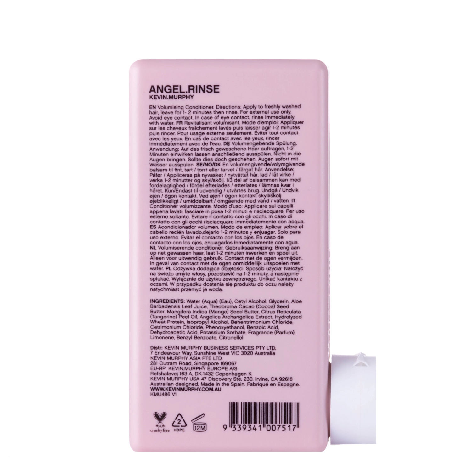 Kevin Murphy - Angel Rinse - odżywka dodająca objętości i wzmacniająca włosy zniszczone koloryzacją i zabiegami fryzjerskimi. Zawiera masło mango, które uelastycznia włosy, a także masło kakaowe, które chroni przed utratą wilgoci i działaniem czynników zewnętrznych. Z kolei sok z aloesu nawilża włosy i łagodzi podrażnienia skóry głowy. Hydrolizat protein pszenicy działa regenerująco, a dodatkowo zmniejsza elektryzowanie włosów. Włosy są miękkie, a ich objętość zostaje przywrócona.