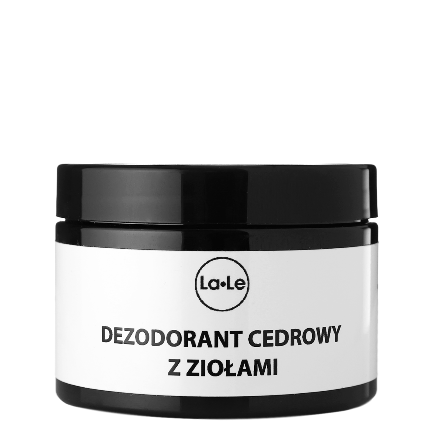 La-Le - Dezodorant Cedrowy z Ziołami - dezodorant o ziołowym zapachu cedru, stworzony na bazie oleju kokosowego, który ułatwia nakładanie i rozprowadzanie produktu, a ponadto wykazuje właściwości ochronne i antybakteryjne. Z kolei masło shea wraz z woskiem pszczelim nawilża i łagodzi podrażnienia. Zawiera także sodę oczyszczoną neutralizującą bakterie powodujące przykry zapach oraz skrobię i ziemię okrzemkową, które wiążą krople potu i pochłaniają wilgoć. Kosmetyk jest naturalny.