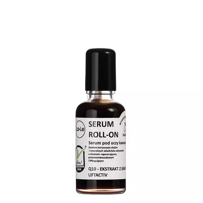 La-Le - Serum Kawowe pod Oczy Roll-On z Koenzymem Q10 - przeciwzmarszczkowe serum na delikaną skórę okolic oczu. Jako bazę produkt zawiera olej słonecznikowy oraz z nasion kawy, które odżywiają, wygładzają i pielęgnują skórę. Serum cechuje się dużą zawartością witaminy E, która działa antyoksydacyjnie a razem z koenzymem Q10 skutecznie przeciwdziałają wolnym rodnikom i chronią przed powstawaniem zmarszczek. Dodatkowym cennym składnikiem mieszanki pod oczy jest ekstrakt z nasion kawy, ujędrniający i stymulujący fizjologię komórek skóry. Serum można łatwo zaaplikować za pomocą rollera, który dodatkowo masuje i pobudza przy tym mikrokrążenie.