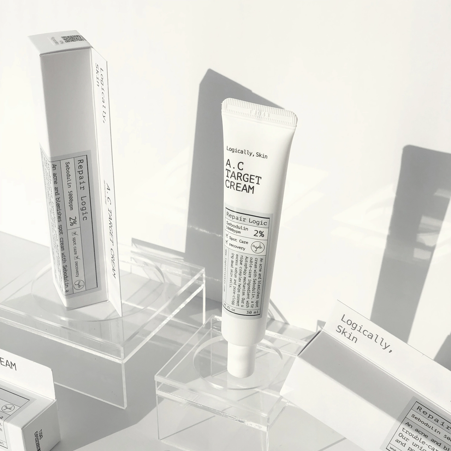 Logically, Skin - A.C Target Cream - punktowy krem na niedoskonałości. Zawarty w składzie kosmetyku peptyd Sebodulin™ ograniczy ilość wydzielanego sebum przez gruczoły łojowe, zredukuje stany zapalne oraz blizny i przebarwienia potrądzikowe, a także wspomoże odbudowę warstwy hydrolipidowej skóry. Dodatek pantenolu załagodzi wszelkie podrażnienia, a olej z nasion słonecznika, dzięki zawartości wielu cennych substancji odżywczych wspomoże regenerację naskórka oraz stworzy na jego powierzchni film, który ochroni go przed nadmierną utratą wody. Produkt jest odpowiedni dla wegan.