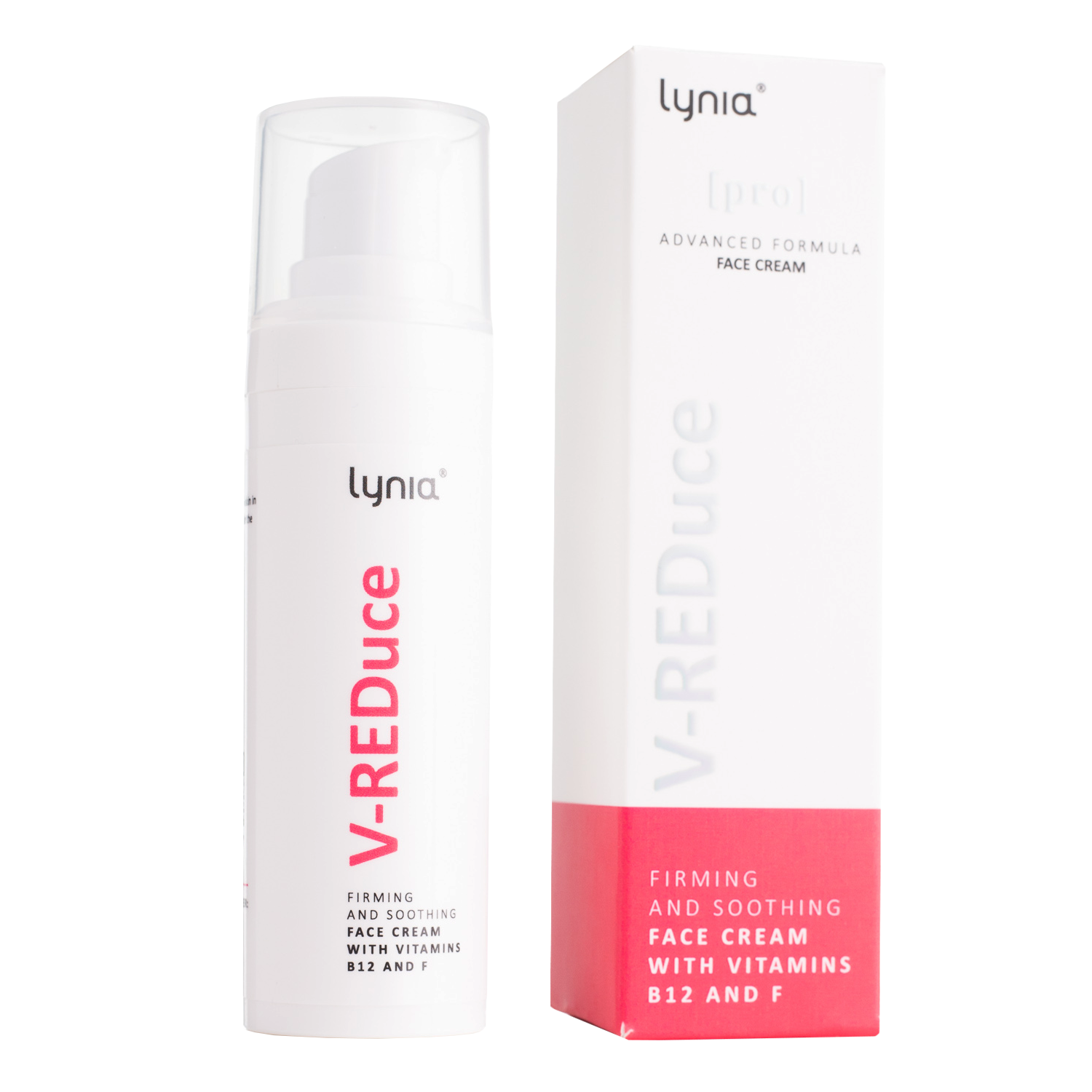 Lynia - Pro - V-REDuce - krem do twarzy z kompleksem witamin o działaniu ujędrniającym i łagodzącym. Posiada udowodnione właściwości redukujące zaczerwienienia oraz poprawiające jędrność skóry. W jego formule zastosowano witaminę B12, która redukuje rumień oraz wspomaga pielęgnację cery wrażliwej i skłonnej do trądziku różowatego. Witamina F poprawia sprężystość wiotkiej skóry, a witaminy E i C działają antyoksydacyjnie i przeciwstarzeniowo. Witamina B3 koi delikatną skórę, a witamina B5 odpowienio ją nawilża i dodaje miękkości. Dzięki regularnemu stosowaniu kremu cera staje się bardziej elastyczna, promienna i złagodzona.