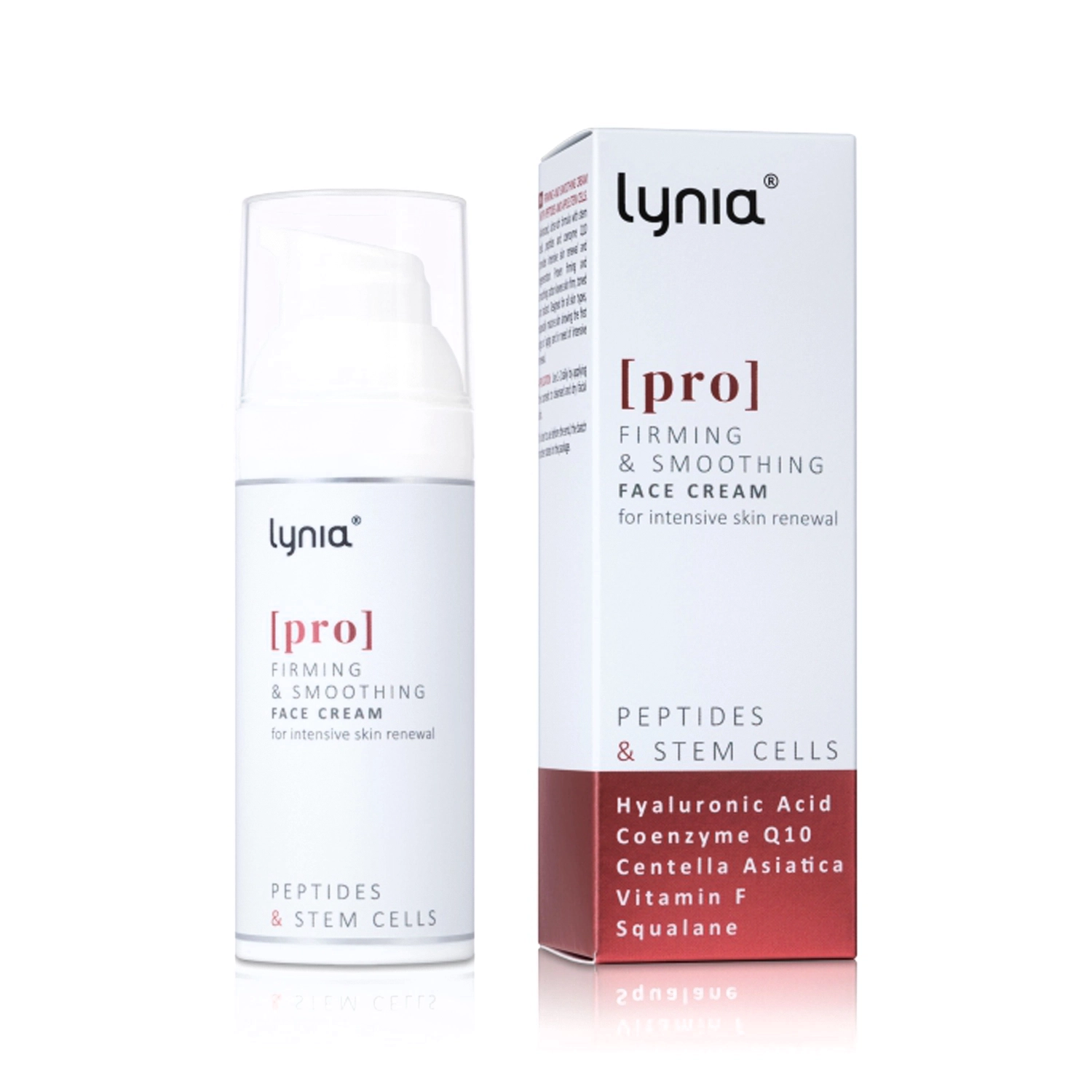 Lynia - Pro - Krem Ujędrniająco - Wygładzający z Peptydami i Komórkami Macierzystym - krem o właściwościach ujędrniających i wygładzających powierzchnię skóry. Obecne w formule peptydy wyraźnie wygładzają, uelastyczniają, stymulują produkcję kolagenu i pobudzają procesy regeneracji, a komórki macierzyste pozyskane z jabłka wspierane przez koenzym Q10 chronią przed przyspieszonym starzeniem skóry. Dodatek ekstraktu z wąkroty azjatyckiej i kwasu hialuronowego łagodzi podrażnienia, zapewnia optymalny poziom nawilżenia i przywraca skórze komfort. Produkt został stworzony z myślą o łączeniu działania przeciwstarzeniowego z głęboko nawilżającym, a zamknięty został w higienicznym opakowaniu typu airless. Formuła kremu jest wegańska.