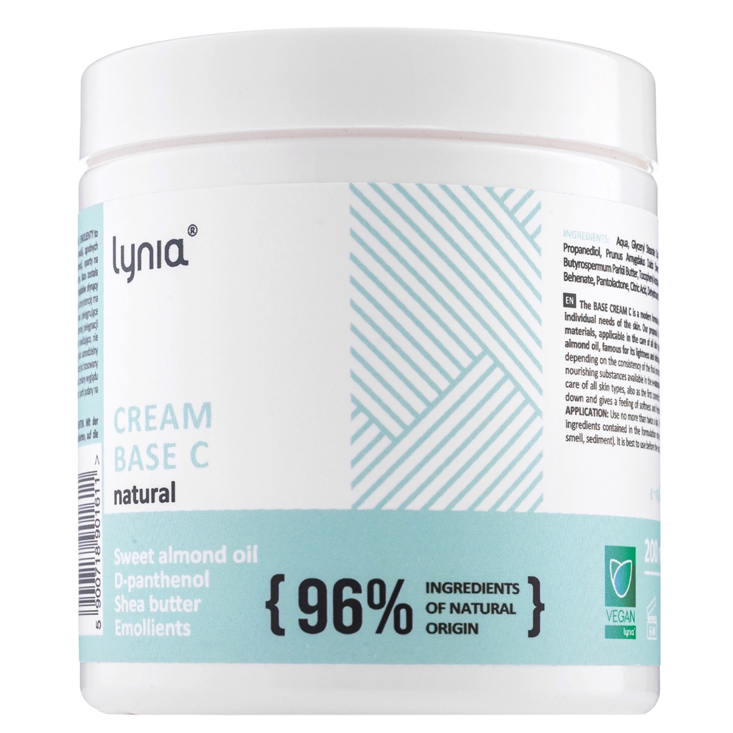 Lynia - Cream Base C Natural - Lekki Nawilżający Krem Bazowy z Witaminami B5 i E - krem bazowy o lekkiej konsystencji, oparty na surowcach naturalnych, mający zastosowanie w pielęgnacji każdego rodzaju skóry. Baza została wzbogacona o pantenol i witaminę E. Do jej stworzenia został użyty olej ze słodkich migdałów słynący z lekkości oraz delikatności. Działa nawilżająco, nie obciąża oraz daje uczucie miękkości i świeżości. Krem bazowy może być stosowany jako samodzielny kosmetyk.