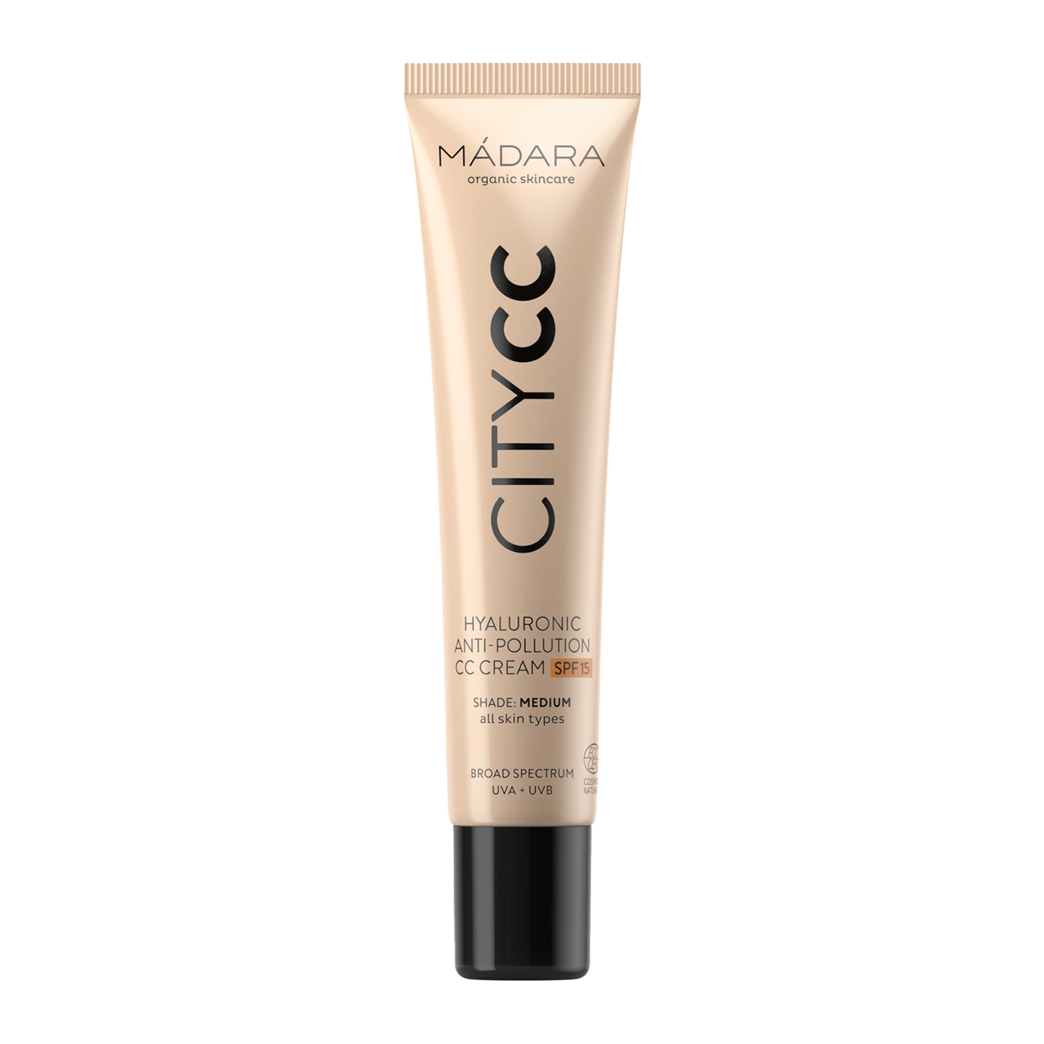 Madara - City CC CityCC Hyaluronic Anti-Pollution SPF15 - 02 Medium Beige - krem CC, który stanowi doskonały zamiennik podkładu w codziennym makijażu twarzy. Oprócz naturalnego krycia o możliwości stopniowania zapewnia rozświetlające wykończenie i ma lekką, nawilżającą formułę wzbogaconą o filtry fizyczne z deklarowaną ochroną SPF15. Formuła na bazie soku z aloesu poprawia poziom nawilżenia skóry, a także obniża jej stan zapalny, a dodatek wosku pszczelego odżywia i wspomaga regenerację. Kolor Medium Beige to kolor beżowy z delikatnymi ciepłymi tonami. Produkt nietestowany na zwierzętach oraz odpowiedni dla wegan i wegetarian.
