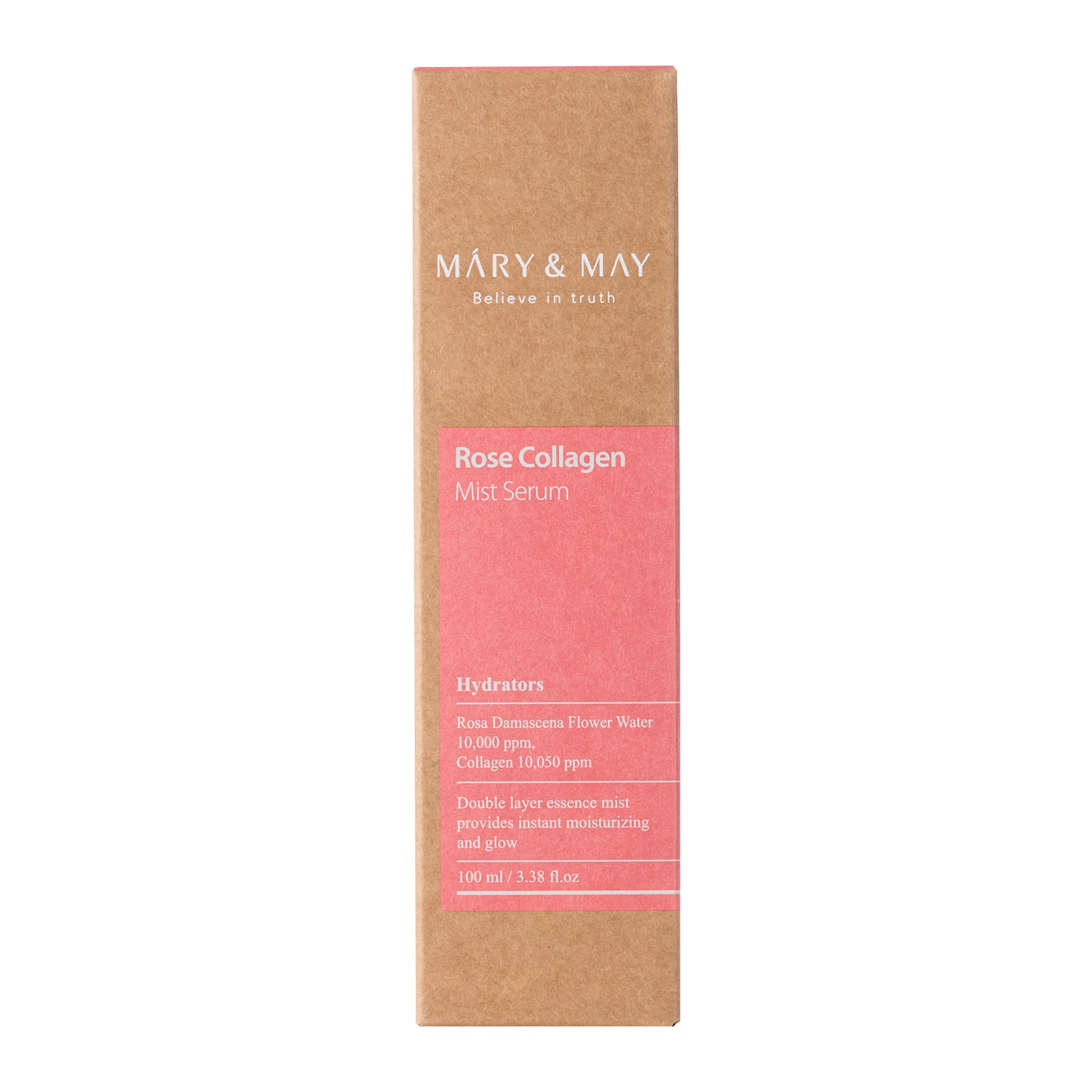 Mary&May - Rose Collagen Mist Serum - dwufazowe serum do twarzy w mgiełce. Zawiera nawilżającą fazę wodną oraz odżywczą fazę olejową. Posiada wygodny aplikator. Produkt bazuje na łagodzącym hydrolacie z róży damasceńskiej. Dodatek kolagenu wygładza i poprawia elastyczność, a niacynamid rozjaśnia przebarwienia i reguluje wydzielanie sebum. Olej z awokado odżywia, wygładza i uzupełnia niedobory lipidów w skórze. Produkt jest wegański i hipoalergiczny.