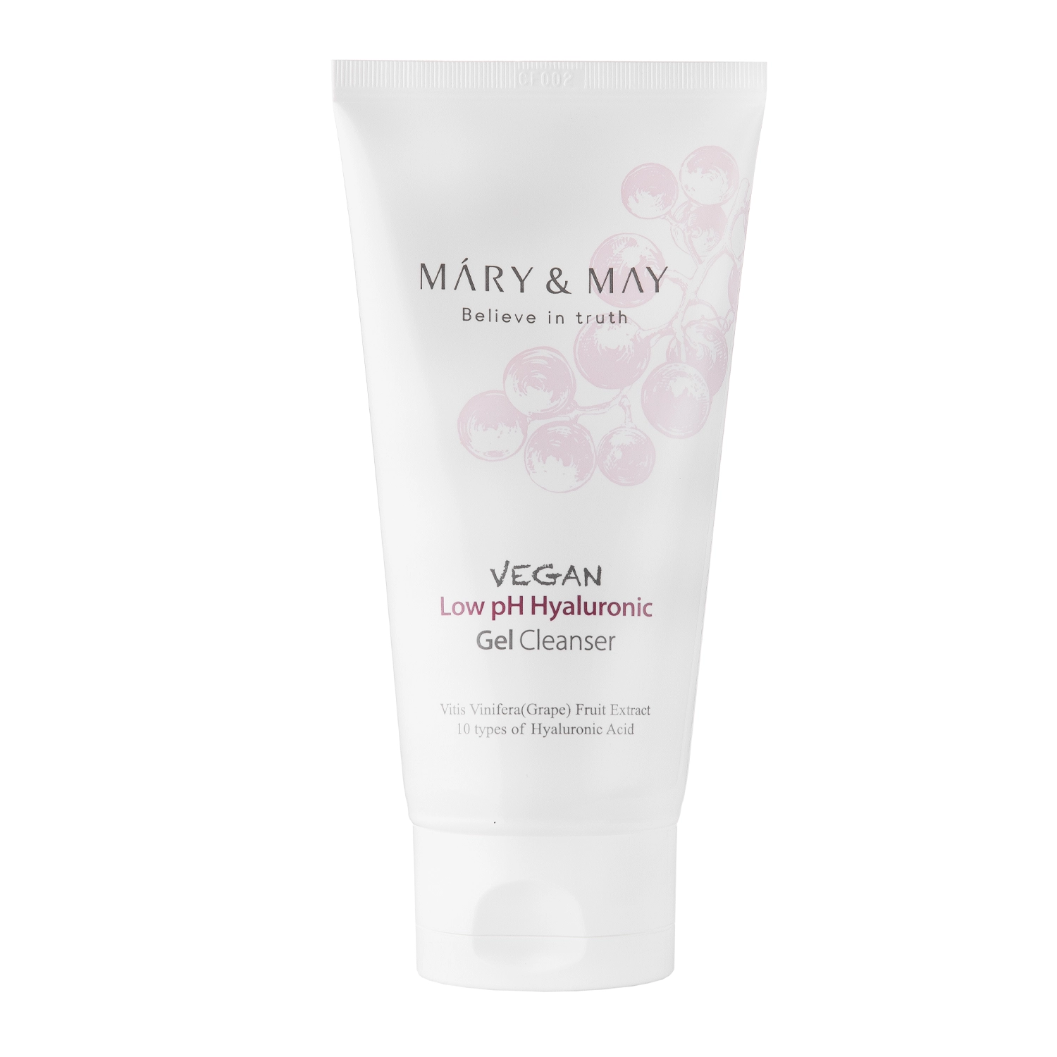 Mary&May - Vegan Low pH Hyaluronic Gel Cleanser - żel do mycia twarzy o niskim pH. Dzięki zastosowaniu łagodnych środków myjących nie zaburza pH skóry po umyciu, a nawilżające i łagodzące składniki aktywne, takie jak: kwas hialuronowy, beta-glukan, czy ekstrakt z wąkroty azjatyckiej oraz dodatek ekstraktu z owoców winogrona sprawiają, że produkt sprawdzi się przy skórze wrażliwej. Formuła żelu jest wegańska.