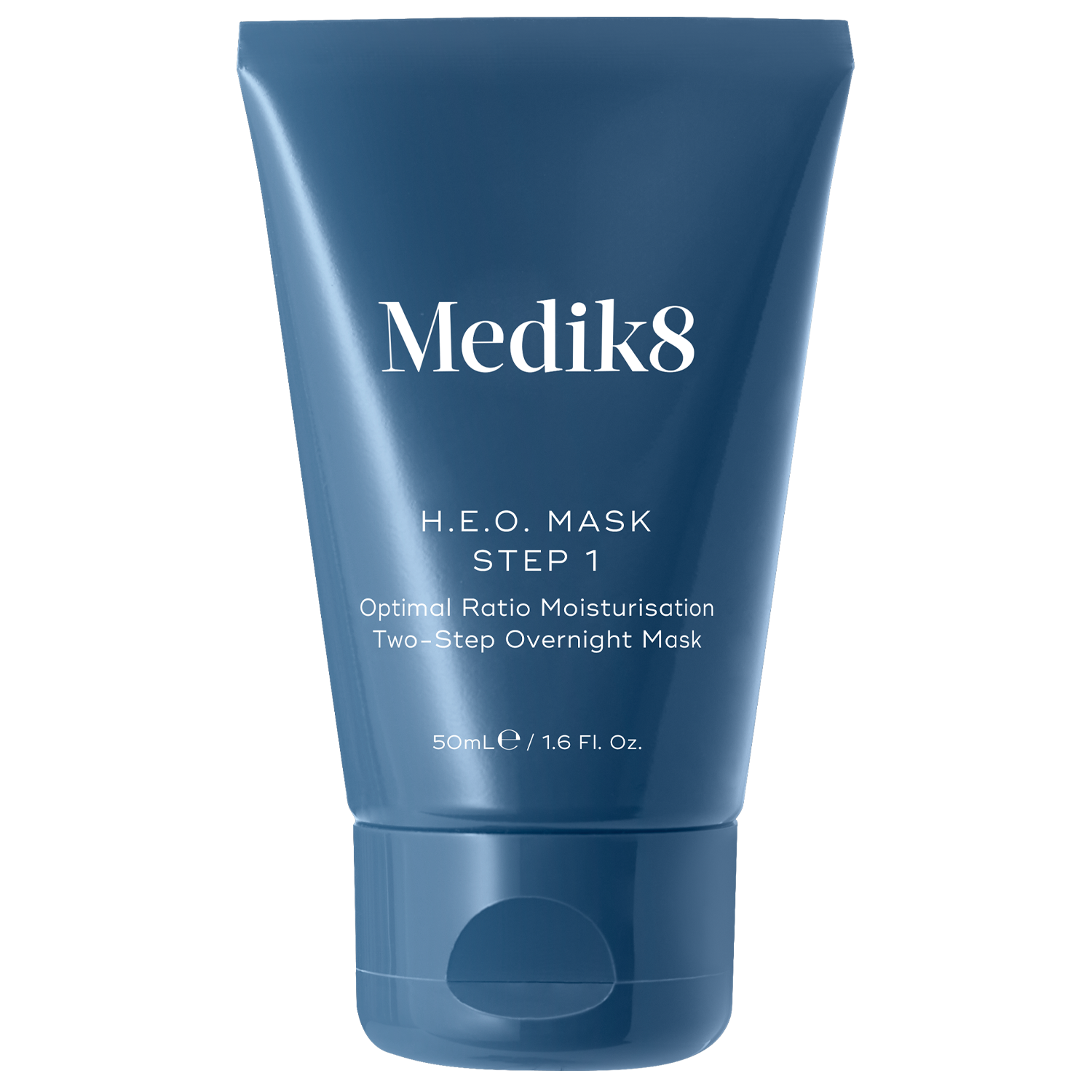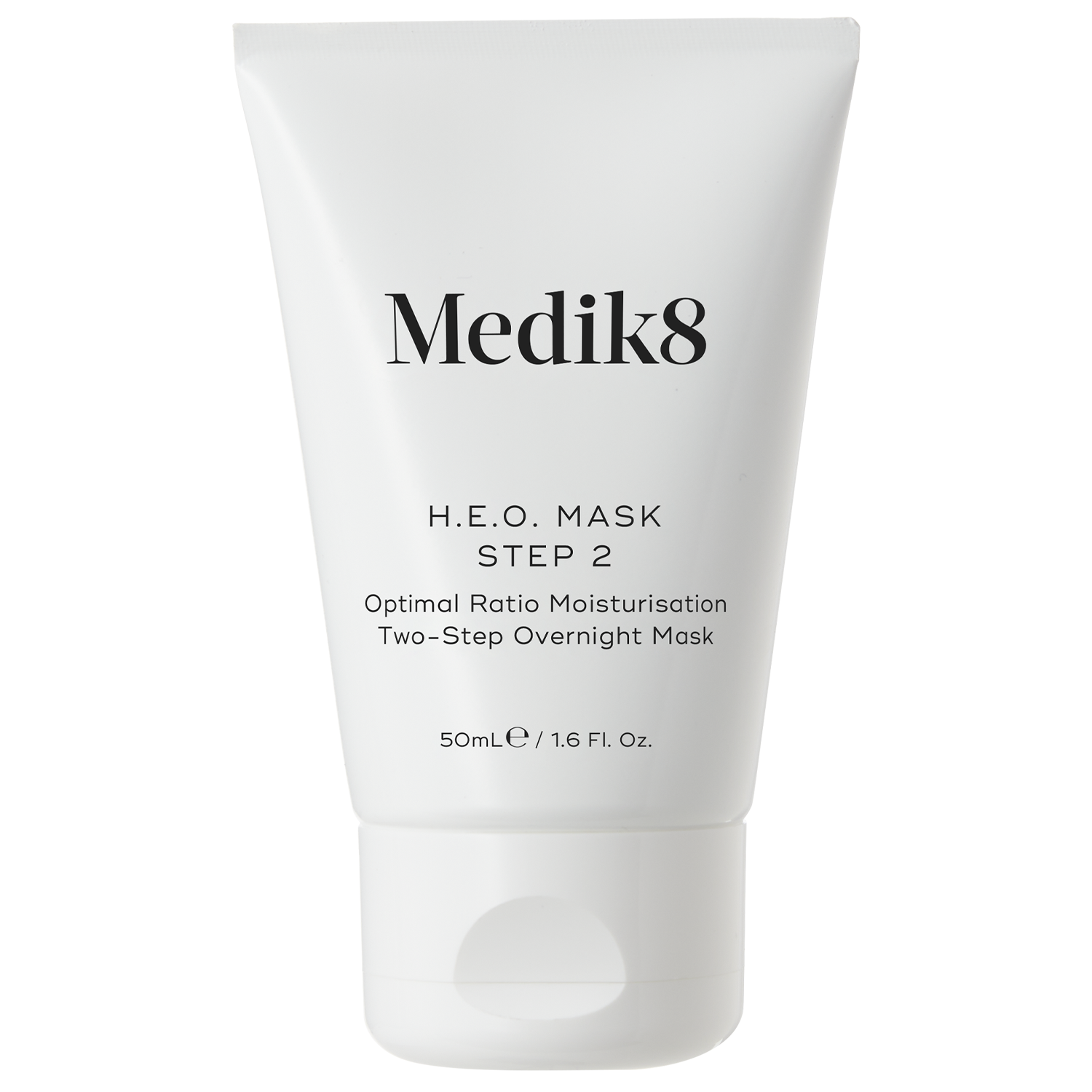 Medik8 - H.E.O. Mask - nocna maska do twarzy złożona z dwóch etapów. Pierwsza maska jest żelowa, natomiast druga kremowa. Stosowane razem i pozostawione na noc zapewniają głębokie nawilżenie i ujędrnienie skóry. Ich formuły są zestawione z humektantów, emolientów oraz składników okluzyjnych. W składzie zawarto głęboko nawilżający hialuronian sodu, a także mocznik, który zwiększa wiązanie wody i obniża jej utratę, dzięki czemu wspomaga nawilżenie. Kwas mlekowy zmiękcza, a skwalan odżywia. Ponadto ceramidy wykazują właściwości regenerujące i wzmacniające skórę. Kosmetyk przyjazny weganom