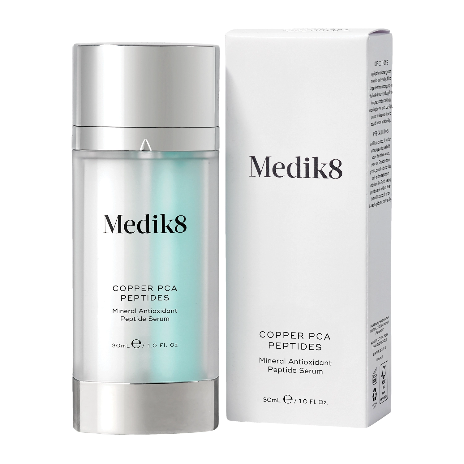 Medik8 - Copper PCA Peptides - serum do pielęgnacji skóry twarzy. Dzięki zawartości peptydów i piroglutaminianu miedzi działa przeciwzmarszczkowo. Substancje te są jednymi z najskuteczniejszych w pielęgnacji anti-aging. Właściwości regeneracyjne i poprawiające ogólną kondycję skóry posiada też zawarty w serum niacynamid oraz wyciąg z wąkroty azjatyckiej. Dodatek wyciągu z korzenia żeń-szenia działa antyoksydacyjnie i zapobiega powstawaniu zmarszczek. Preparat znacząco pomaga skórze się zregenerować. Z tego względu może okazać się również skutecznym środkiem podczas pielęgnacji przeciwtrądzikowej oraz mającej na celu zregenerowanie się skóry po przejściu licznych stanów zapalnych i niedoskonałości. Produkt jest less waste i odpowiedni dla wegan.
