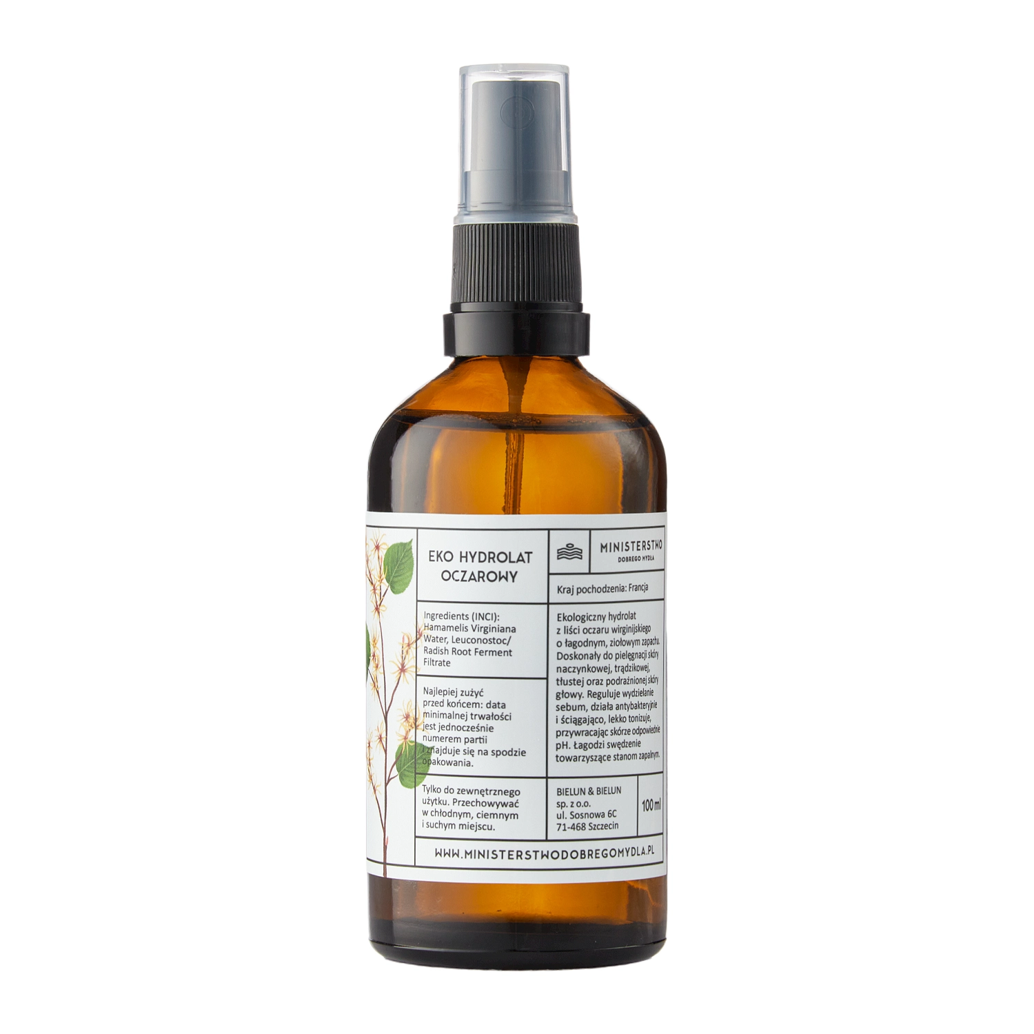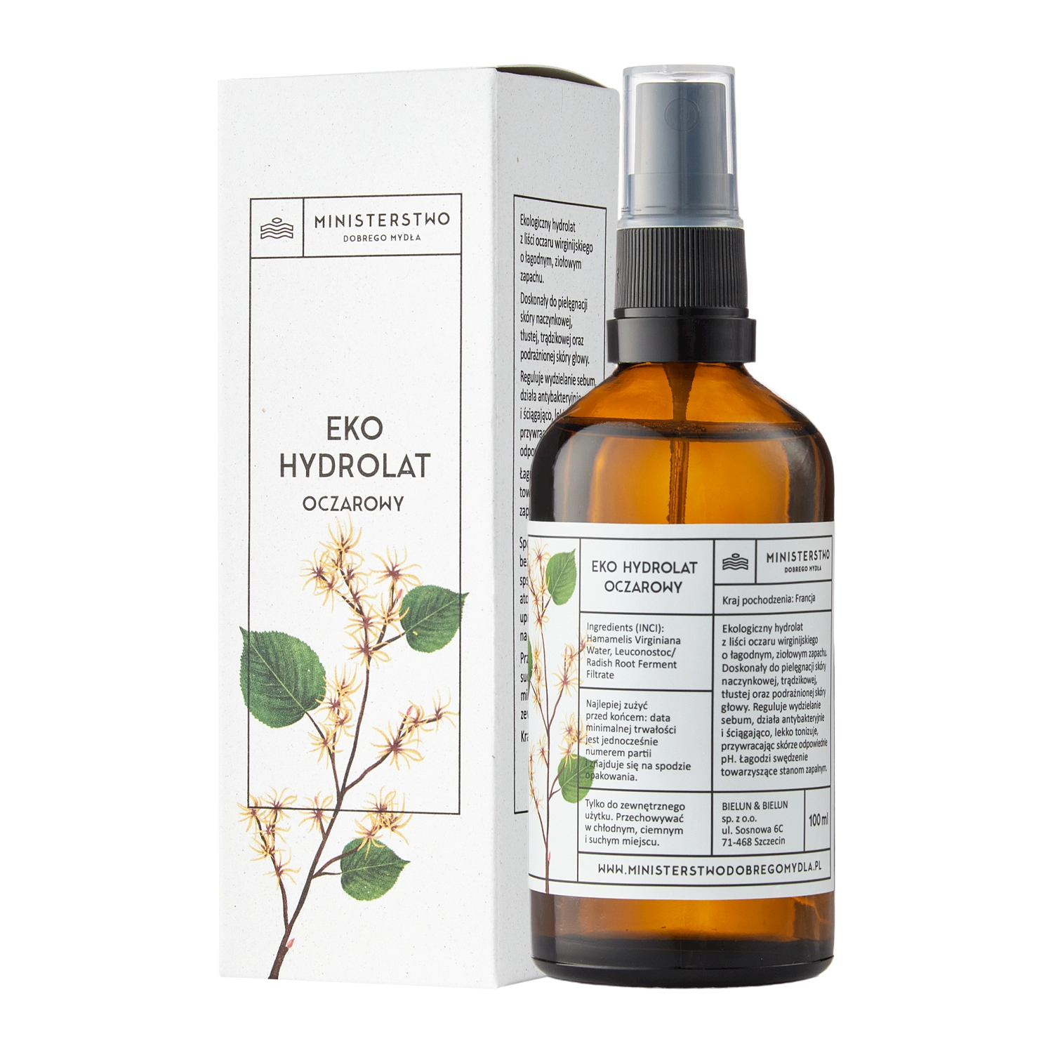 Ministerstwo Dobrego Mydła - Hydrolat Oczarowy - hydrolat z oczaru wirginijskiego o właściwościach przeciwzapalnych i tonizujących. Działa ściągająco, wspomaga gojenie i regenerację podrażnionej skóry, odświeża, a także reguluje pracę gruczołów łojowych, zmniejszając produkcję sebum. Ze względu na jego działanie antybakteryjne, najlepiej sprawdzi się przy cerze tłustej i mieszanej. Produkt jest w 100% naturalny - jego zapach, kolor i konsystencja mogą się więc nieznacznie różnić w zależności od partii, posiada również charakterystyczny zapach. Jego pH wynosi pomiędzy 5,0, a 5,5. Jest odpowiedni dla wegan i zgodny z less waste.