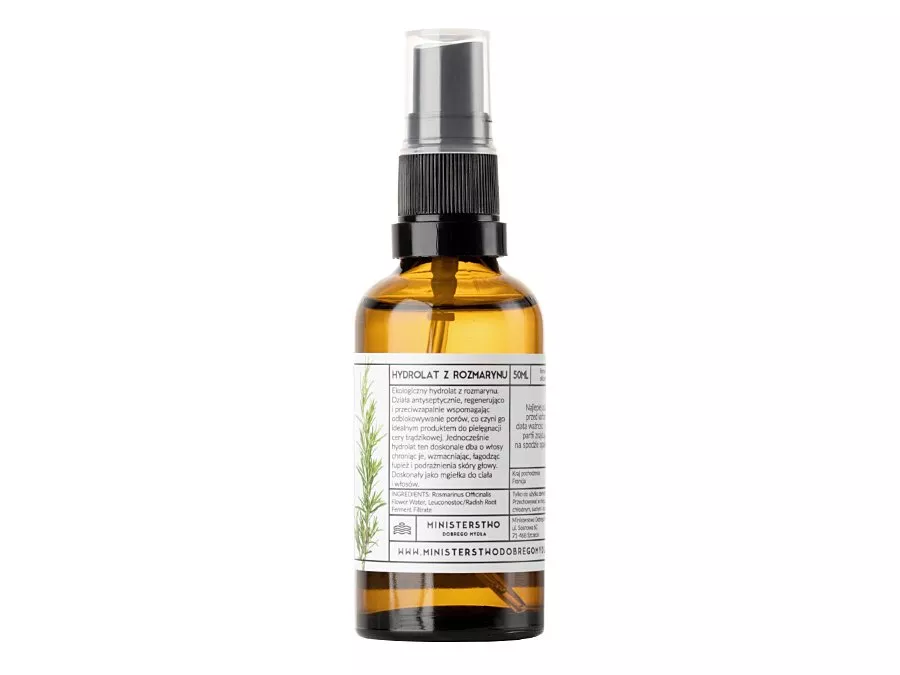 Ministerstwo Dobrego Mydła - Hydrolat Rozmarynowy - hydrolat z rozmarynu o właściwościach przeciwzapalnych i tonizujących. Przyspiesza procesy regeneracyjne, wspomaga walkę z łupieżem, odświeża, a także reguluje pracę gruczołów łojowych. Ze względu na jego działanie antybakteryjne i kojące sprawdzi się u skór problematycznych, a także wrażliwych. Produkt jest zgodny z ideą less waste i w 100% naturalny - jego zapach, kolor i konsystencja mogą się więc nieznacznie różnić w zależności od partii, posiada również charakterystyczny zapach. Jego pH wynosi pomiędzy 5,0, a 5,5.