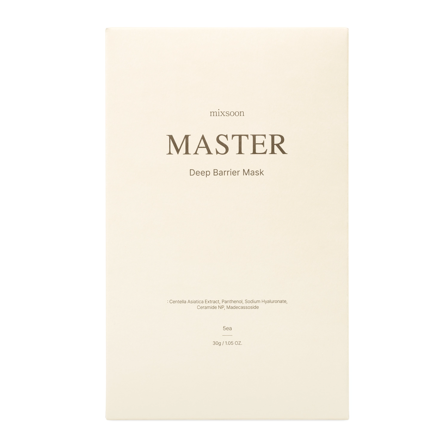 Mixsoon - Master Deep Barrier Mask - zestaw 5 masek w płachcie wzmacniających barierę hydrolipidową. Zostały nasączone esencją bogatą w ekstrakt z wąkroty azjatyckiej, który działa silnie kojąco i regenerująco. Dzięki dodatkowi ceramidów i kwasu hialuronowego produkt odżywia przesuszoną skórę oraz zapewnia odpowiedni poziom nawilżenia. Połączenie pantenolu i alantoiny łagodzi podrażnienia oraz zaczerwienienia. Maski zostały wykonane z przyjemnego materiału, który dobrze przylega do skóry. Świetnie sprawdzą się w pielęgnacji cery suchej, z zaburzoną barierą hydrolipidową.