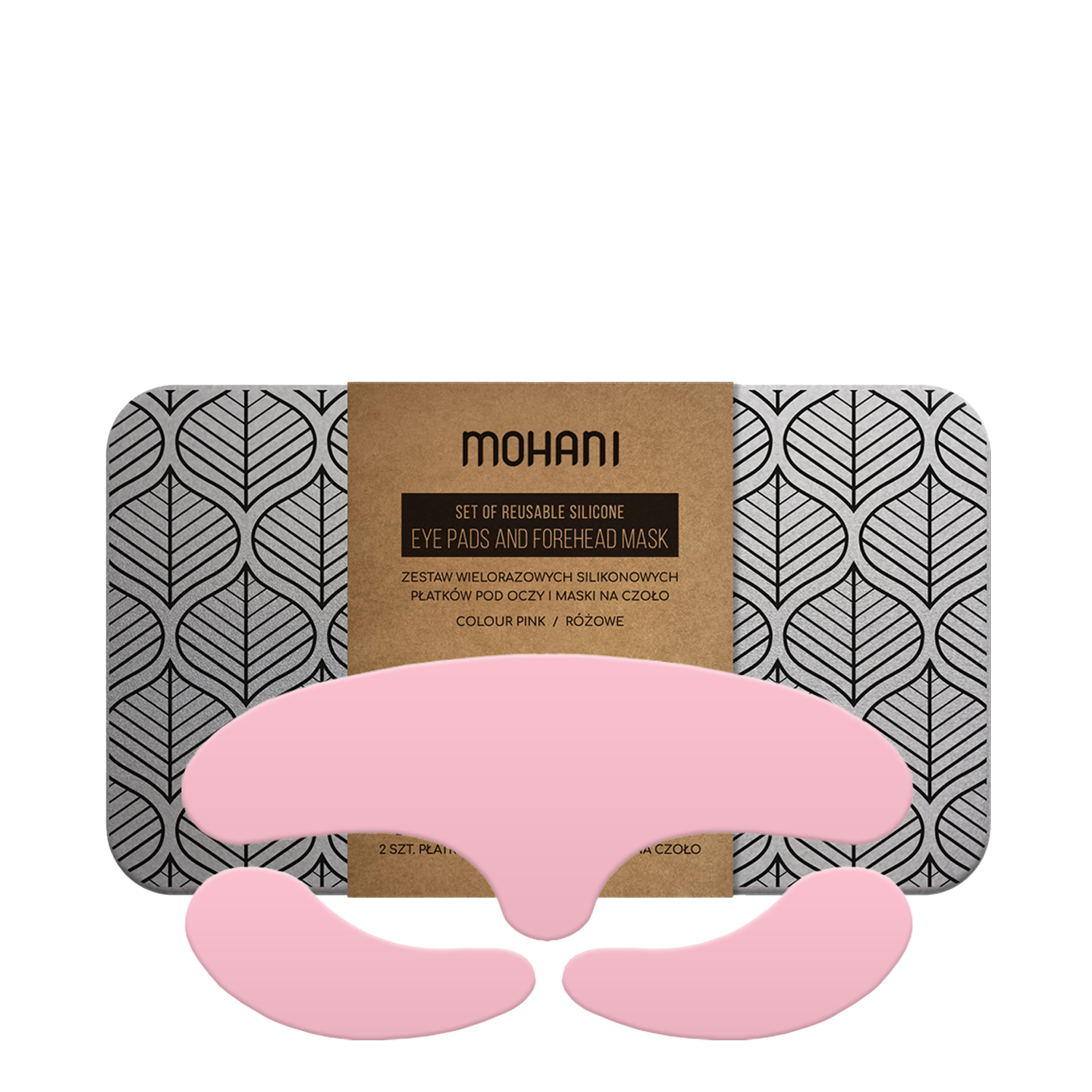 Silikonowe płatki pod oczy oraz maska na czoło marki Mohani - wielorazowe płatki pod oczy i maska na czoło, które ukoją twoją skórę. Płatki i maskę możesz stosować w zestawieniu z ulubionym serum lub kremem do pielęgnacji skóry. Potęgują one wchłanianie kosmetyków, działając na zasadzie okluzji oraz dodatkowo niwelują drobne zmarszczki i ślady zmęczenia. Po użyciu schowaj je w dedykowanym opakowaniu.