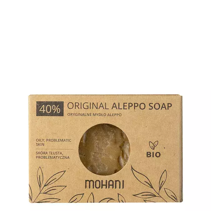 Mohani - Bio - Original Aleppo Soap 40% - naturalne mydło tradycyjne w kostce wyprodukowane w Syrii. Z chemicznego punktu widzenia jest to produkt reakcji tłuszczy z wodorotlenkiem sodu. Z tego względu w składzie mydła są obecne naturalne tłuszcze roślinne: oliwa z oliwek i olej laurowy oraz wodorotlenek sodu. Oliwa z oliwek tak samo jak i olej laurowy mają właściwości oczyszczające. Skutecznie usuwają brud z powierzchni skóry, a jako substancje lipidowe kondycjonują i odżywiają ją. Olej laurowy ma dodatkowe właściwości antybakteryjne, a jego zawartość w produkcie wynosi 40%, co sprawia że mydło może być odpowiednie do codziennego rytuału mycia i odkażania rąk.
