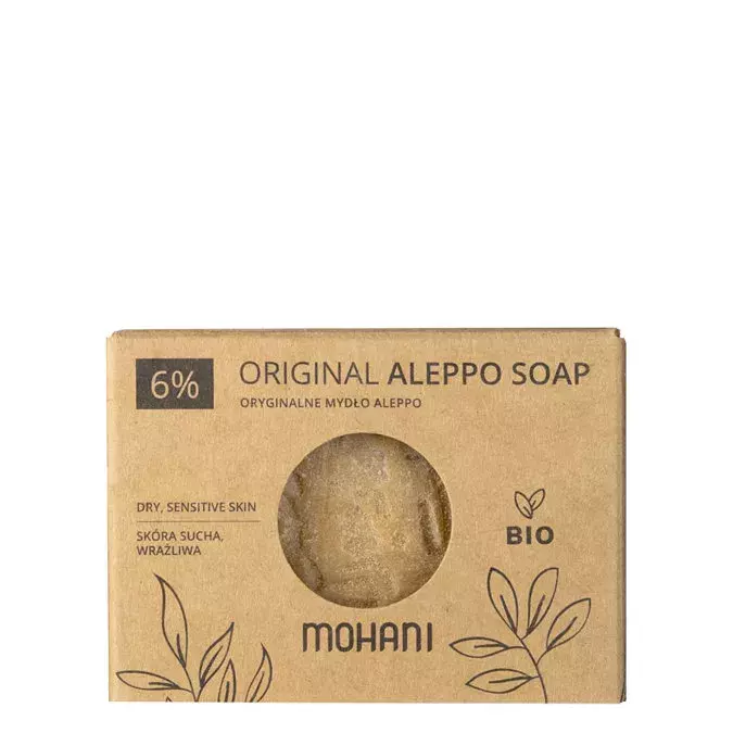 Mohani - Bio - Original Aleppo Soap 6% - naturalne mydło tradycyjne w kostce wyprodukowane w Syrii. Z chemicznego punktu widzenia jest to produkt reakcji tłuszczy z wodorotlenkiem sodu. Z tego względu w składzie mydła są obecne naturalne tłuszcze roślinne: oliwa z oliwek i olej laurowy oraz wodorotlenek sodu. Oliwa z oliwek tak samo jak i olej laurowy mają właściwości oczyszczające. Skutecznie usuwają brud z powierzchni skóry, a jako substancje lipidowe kondycjonują i odżywiają ją. Olej laurowy ma dodatkowe właściwości antybakteryjne, a jego zawartość w produkcie wynosi 6%.